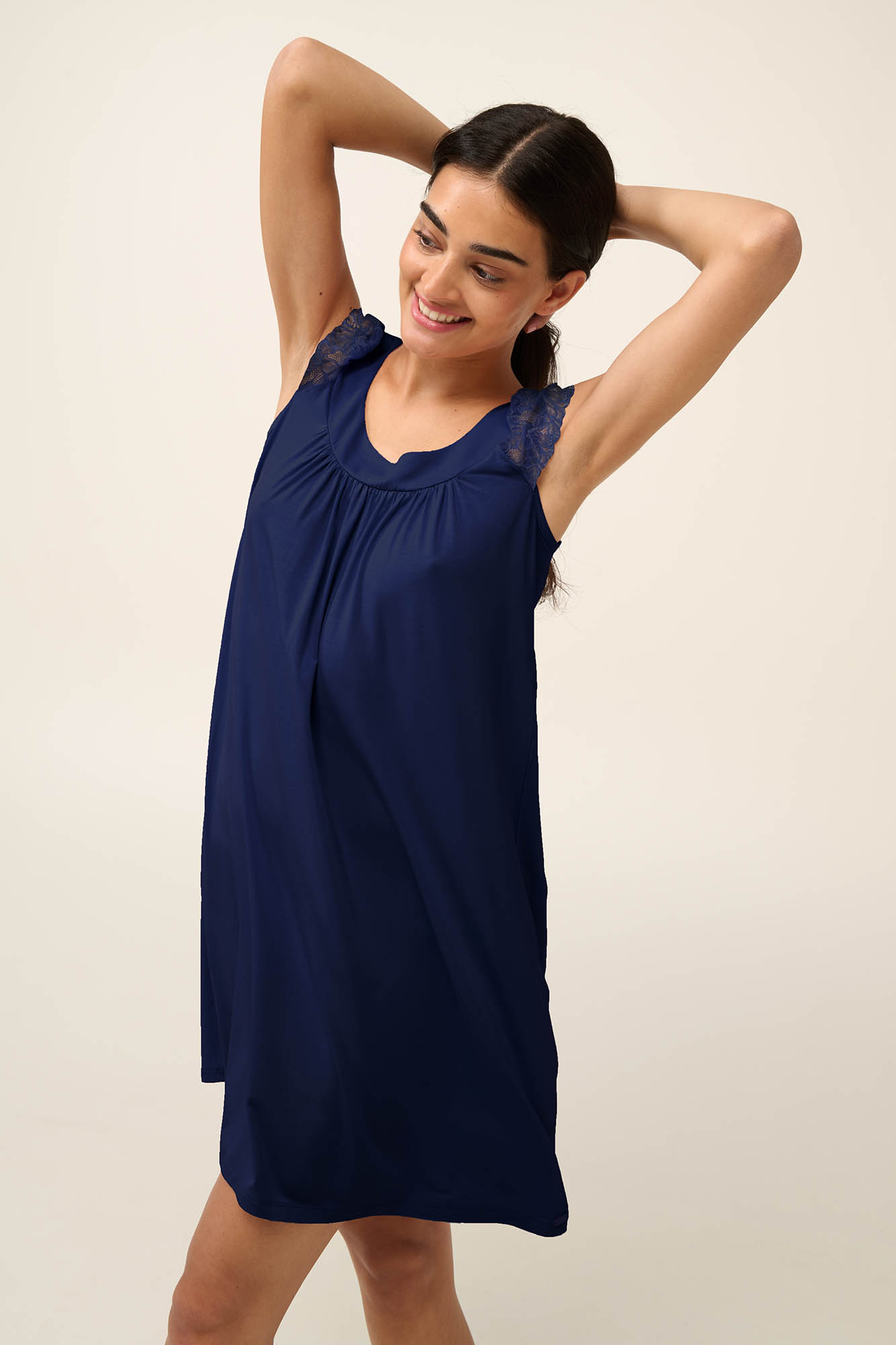 Δώστε στη καθημερινότητα σας μια νότα κομψότητας με ένα μονόχρωμο καλοκαιρινό νυχτικό κοντό μανίκι φτιαγμένο από δαντέλα και σούρες στο στήθος για μέγιστη άνεση. Είναι κατασκευασμένο σε χαλαρή γραμμή από απαλό και διαπνέον micromodal που αγκαλιάζει ευχάριστα το σώμα. Μια δανική πρόταση για τις ζεστές καλοκαιρινές ημέρες που συνδυάζει κλασική γοητεία και ρομαντικές λεπτομέρειες.