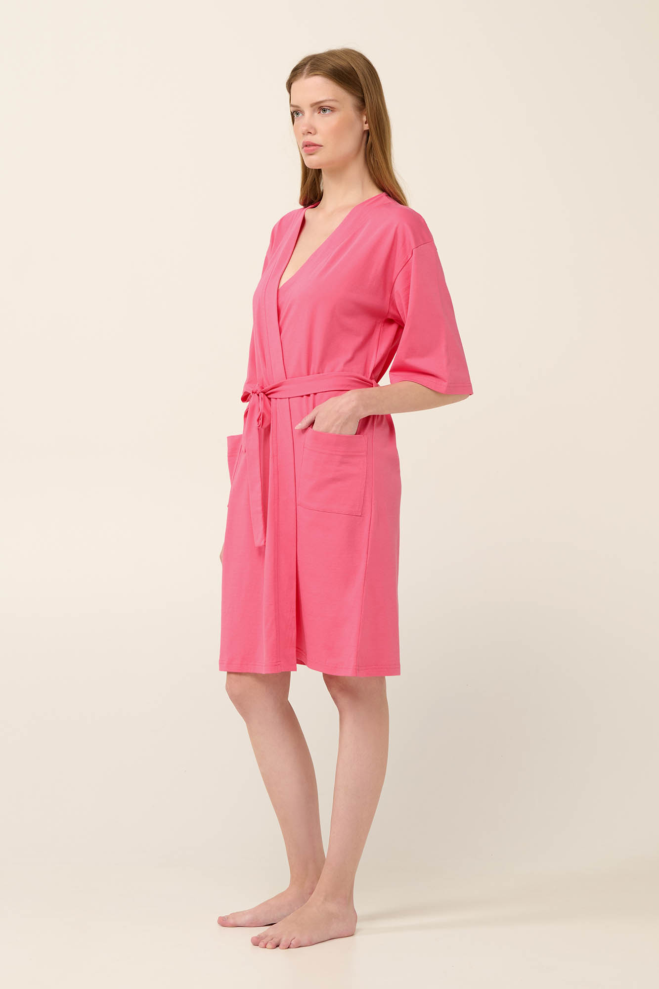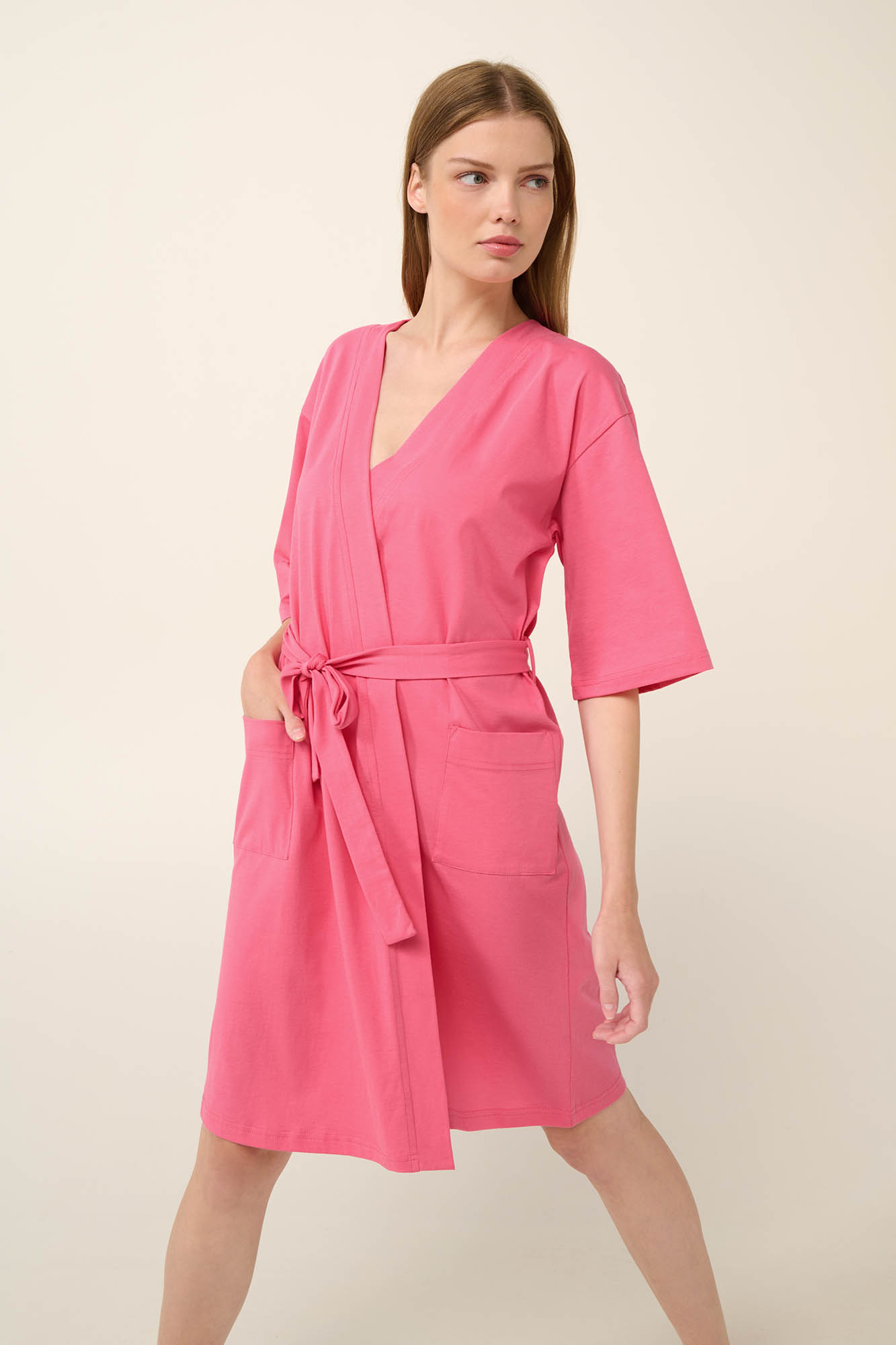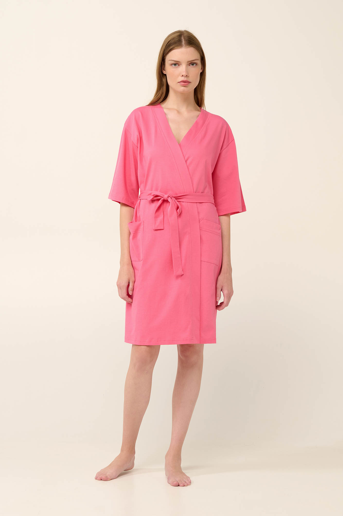 Προσθέστε στη γκαρνταρόμπα σας μια μονόχρωμη καλοκαιρινή ρόμπα σε διαχρονικό σταυρωτό πατρόν, με πρακτικές τσέπες και φαρδιά μανίκια. Είναι κατασκευασμένη από 100% διαπνέον βαμβάκι single jersey που χαρίζει απαλή αίσθηση στο σώμα. Μπορείτε να τη συνδυάσετε με το αγαπημένο σας βαμβακερό νυχτικό ή ένα άνετο σετ εσώρουχα και να απολαύσετε ένα χαλαρό απόγευμα στο σπίτι ή τις καλοκαιρινές σας διακοπές.