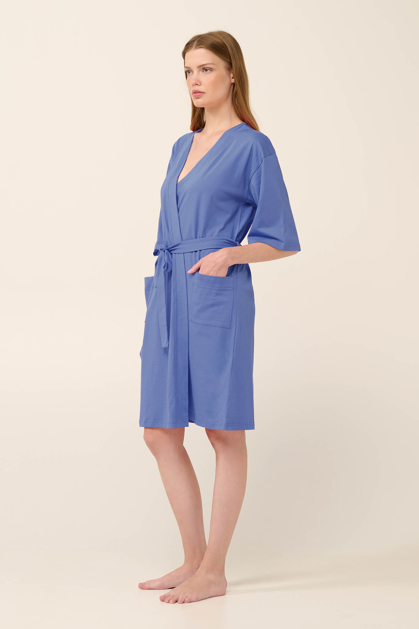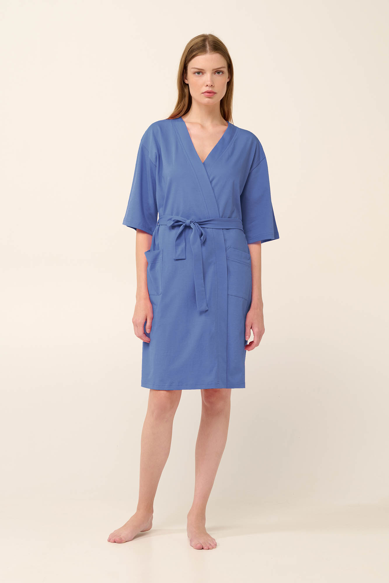 Προσθέστε στη γκαρνταρόμπα σας μια μονόχρωμη καλοκαιρινή ρόμπα σε διαχρονικό σταυρωτό πατρόν, με πρακτικές τσέπες και φαρδιά μανίκια. Είναι κατασκευασμένη από 100% διαπνέον βαμβάκι single jersey που χαρίζει απαλή αίσθηση στο σώμα. Μπορείτε να τη συνδυάσετε με το αγαπημένο σας βαμβακερό νυχτικό ή ένα άνετο σετ εσώρουχα και να απολαύσετε ένα χαλαρό απόγευμα στο σπίτι ή τις καλοκαιρινές σας διακοπές.