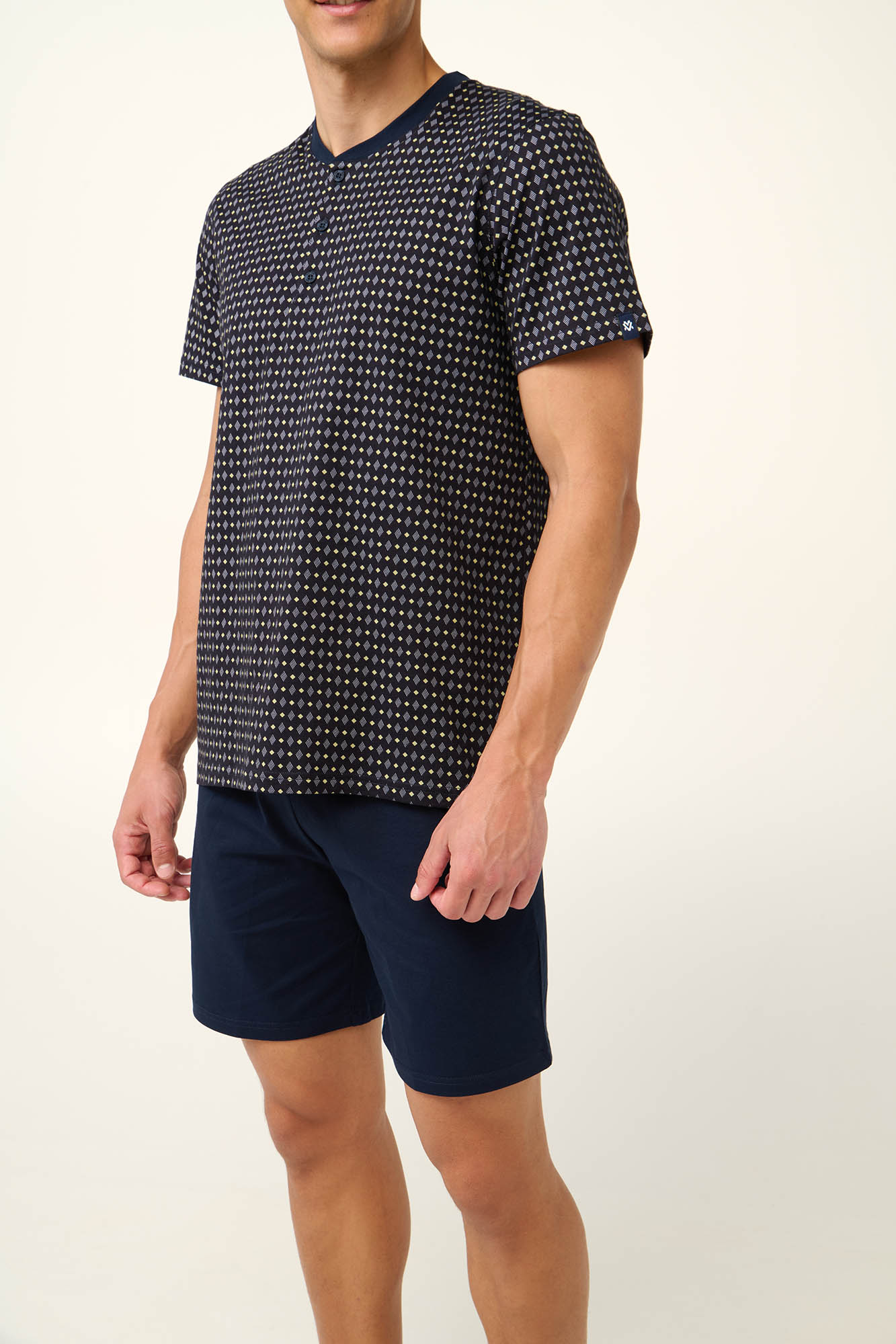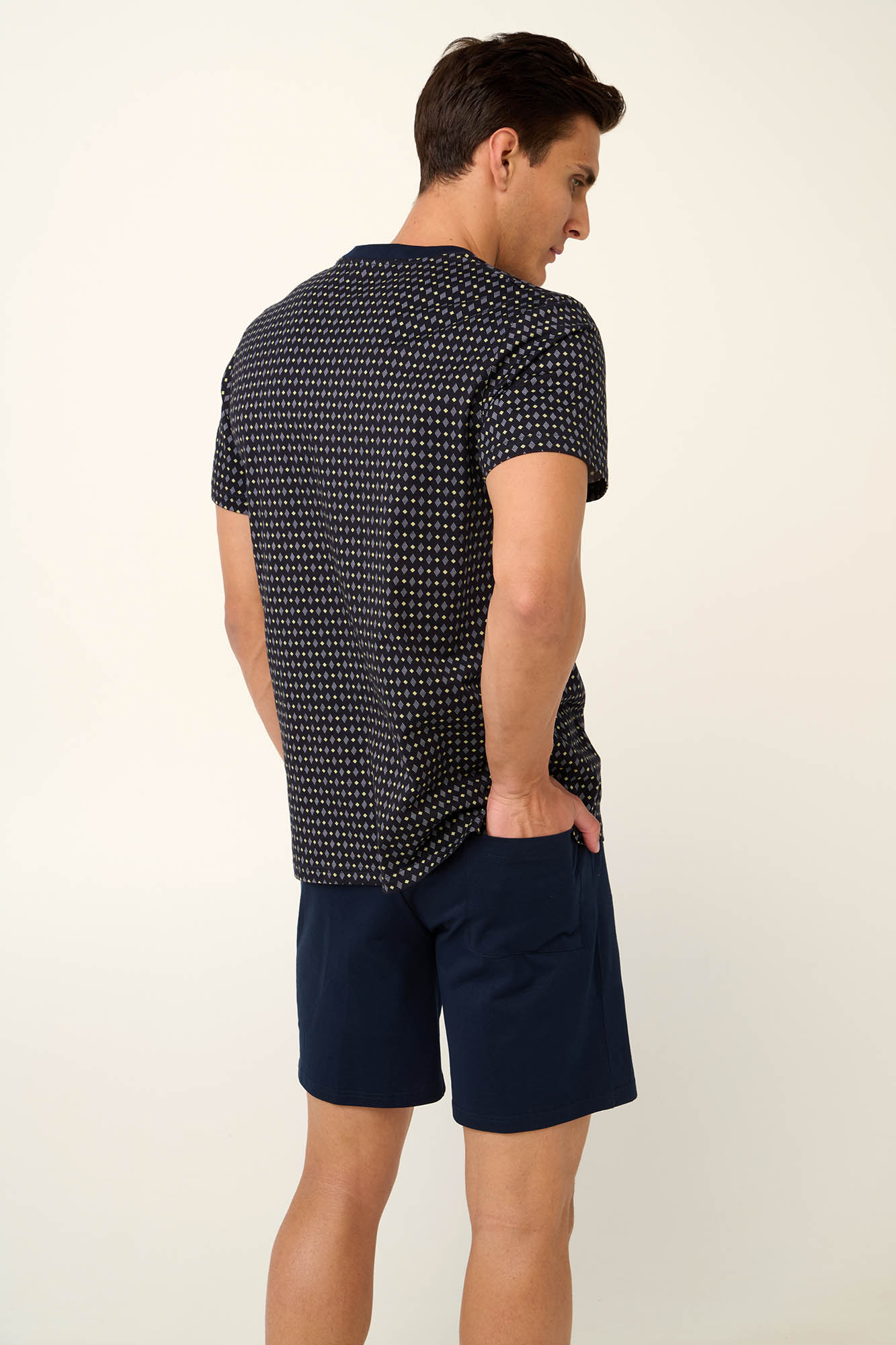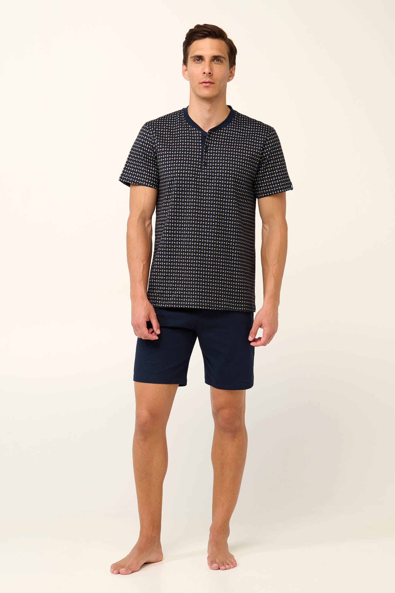 Ανανεώστε την γκαρνταρόμπα σας με ένα σετ ανδρικές καλοκαιρινές πυτζάμες από 100% διαπνέον και απαλό βαμβάκι που θα σας χαρίσει άνεση ακόμα και τις πιο ζεστές ημέρες. Το σετ αποτελείται από μονόχρωμο κοντό παντελόνι με πίσω τσέπη και μπλούζα με κοντό μανίκι και πατιλέτα που προσδίδει κλασική γοητεία δροσερή αίσθηση. Σχεδιασμένο σε διαχρονικό γεωμετρικό μοτίβο με ρόμβους.