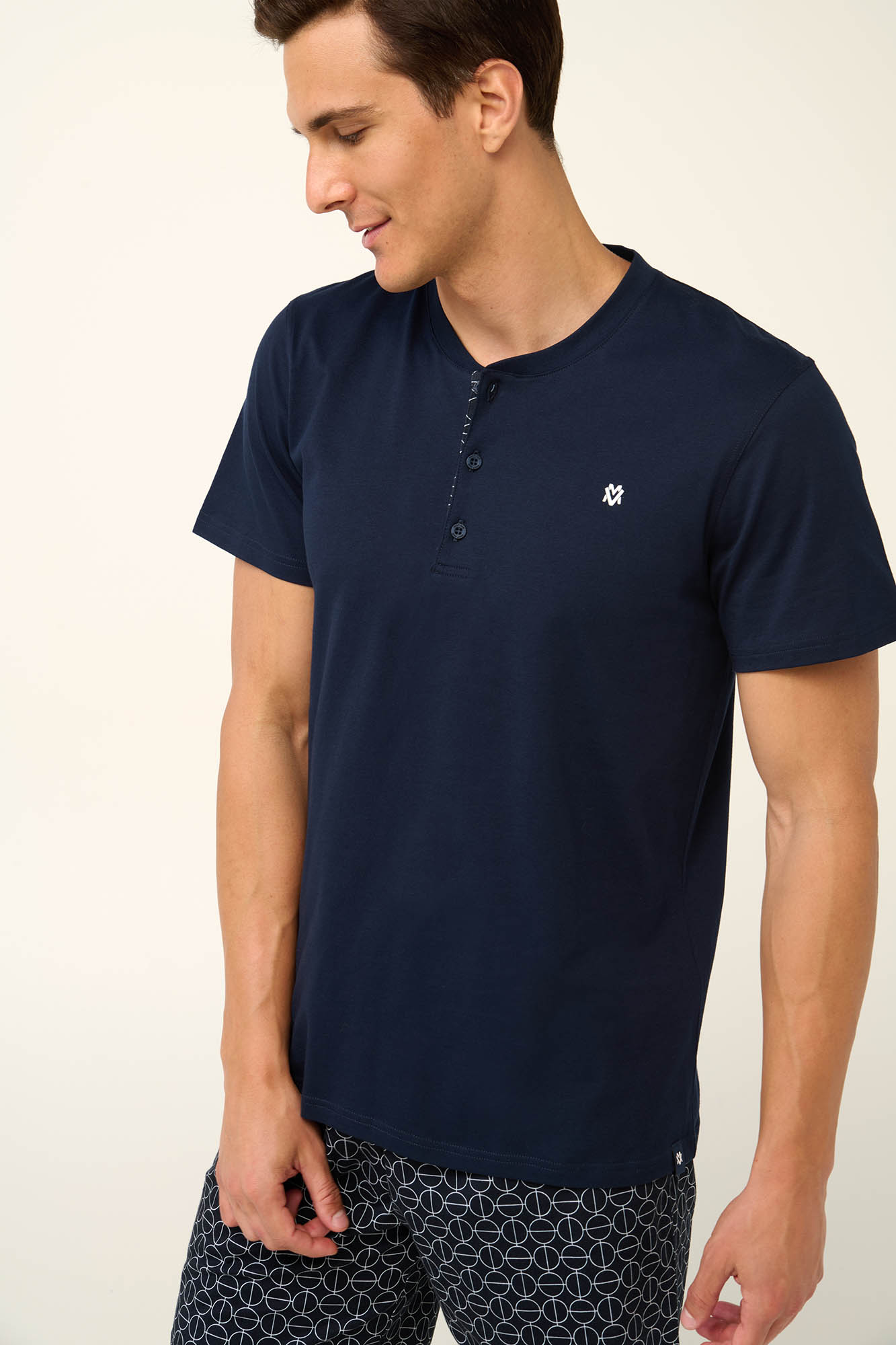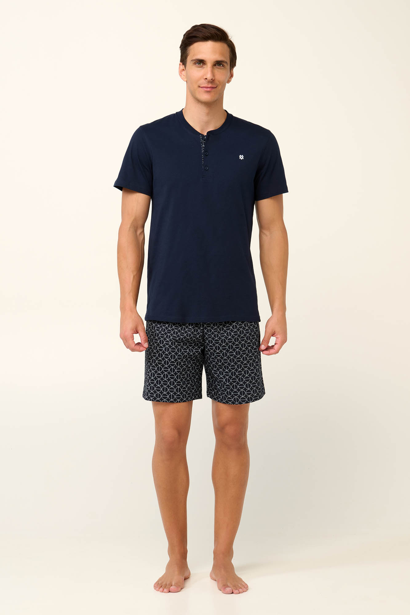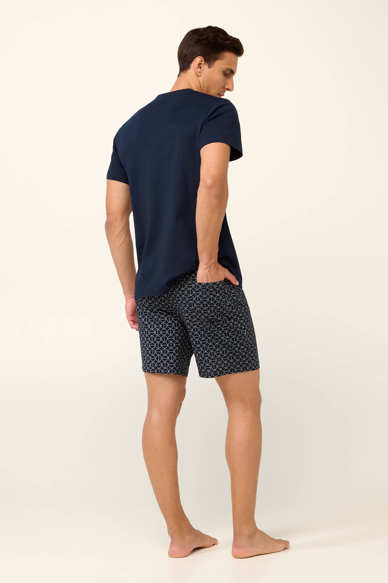 Επιλέξτε ένα σετ καλοκαιρινές ανδρικές πυτζάμες που συνδυάζει άνεση και κομψότητα. Κοντό παντελόνι σε γεωμετρικό μοτίβο με πίσω τσέπη που συνοδεύεται από μονόχρωμη μπλούζα με κοντό μανίκι και πατιλέτα που χαρίζει ανάλαφρη και δροσερή αίσθηση. Το σετ είναι κατασκευασμένο από 100% βαμβάκι single jersey που επιτρέπει στο δέρμα να αναπνέει για να απολαύσετε με διαχρονικό στυλ τις στιγμές χαλάρωσης σας.