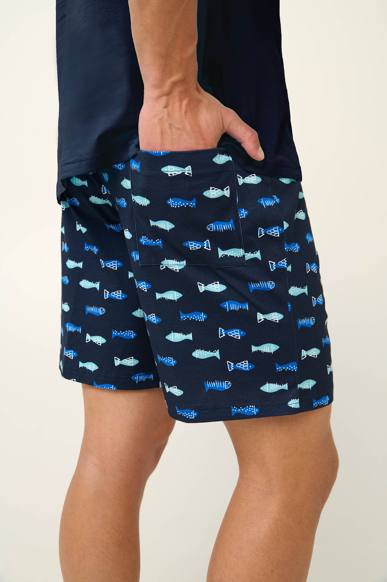 Προσθέστε μια ευχάριστη νότα στη γκαρνταρόμπα σας με ένα σετ καλοκαιρινές ανδρικές πυτζάμες που αποτελείται από κοντό παντελόνι με τσέπη πίσω σε μοτίβο με ψαράκια. Συνοδεύεται από μπλούζα με κοντό μανίκι και τύπωμα στο στήθος. Είναι κατασκευασμένο σε κανονική γραμμή από 100% βαμβάκι single jersey που επιτρέπει στο δέρμα να αναπνέει και χαρίζει απαλή αίσθηση για να απολαύσετε τις στιγμές χαλάρωσης σας.