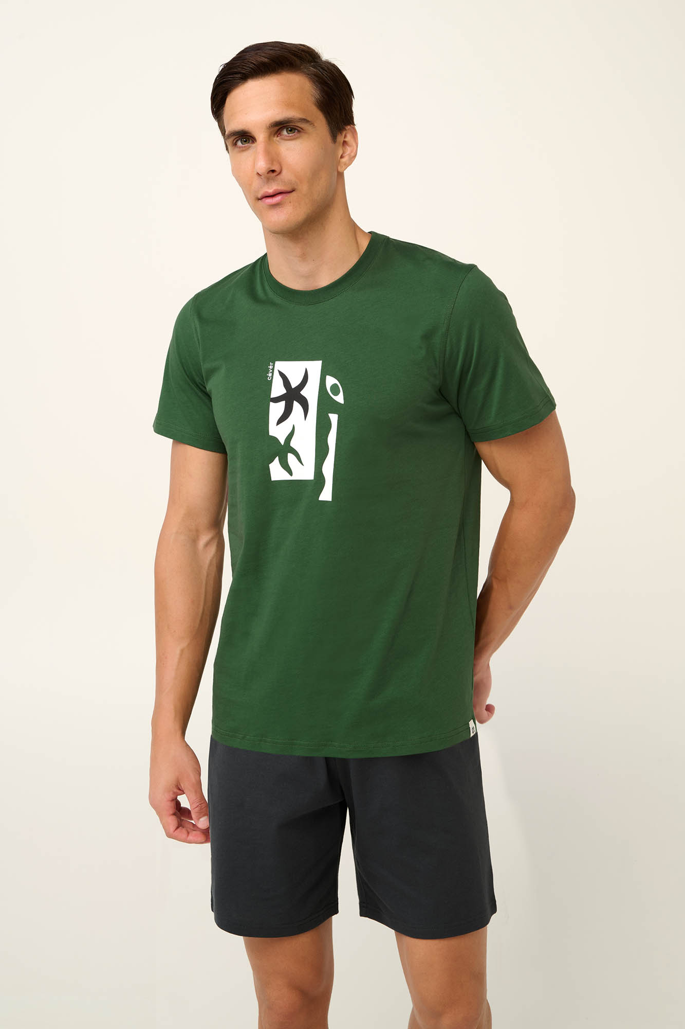 Επιλέξτε ένα σετ καλοκαιρινές ανδρικές πυτζάμες που συνδυάζουν την απλότητα με καθημερινή άνεση. Αποτελείται από μονόχρωμο κοντό παντελόνι με τσέπη πίσω που συνοδεύεται από μπλούζα με κοντό μανίκι και τύπωμα στο στήθος. Το σετ είναι κατασκευασμένο από 100% διαπνέον βαμβάκι που χαρίζει απαλή αίσθηση στο σώμα και θα σας βοηθήσει να παραμείνετε δροσερός και να απολαύσετε το βραδινό σας ύπνο τις πιο ζεστές ημέρες.
