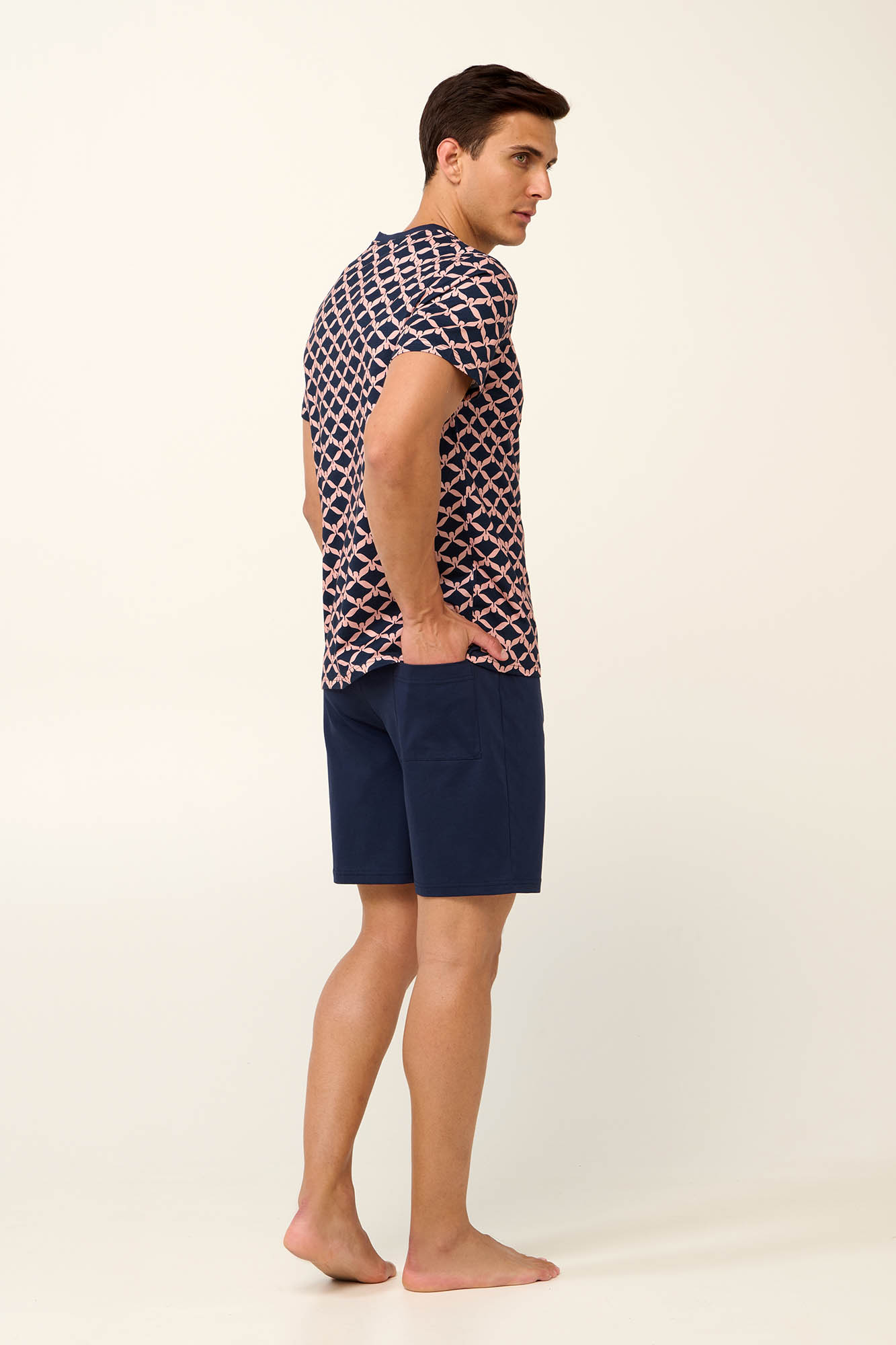 Προσθέστε στη γκαρνταρόμπα σας ένα σετ καλοκαιρινές ανδρικές πυτζάμες που θα σας προσφέρει άνεση κάθε στιγμή της ημέρας. Μονόχρωμο κοντό παντελόνι με πίσω τσέπη και μπλούζα με κοντό μανίκι και κλασική V λαιμόκοψη σε γεωμετρικό μοτίβο με σαλάχι που προσθέτει μια μοντέρνα νότα στο σύνολο. Κατασκευασμένο από 100% διαπνέον βαμβάκι single jersey που θα σας βοηθήσει να χαλαρώσετε μετά από μια μεγάλη ημέρα.