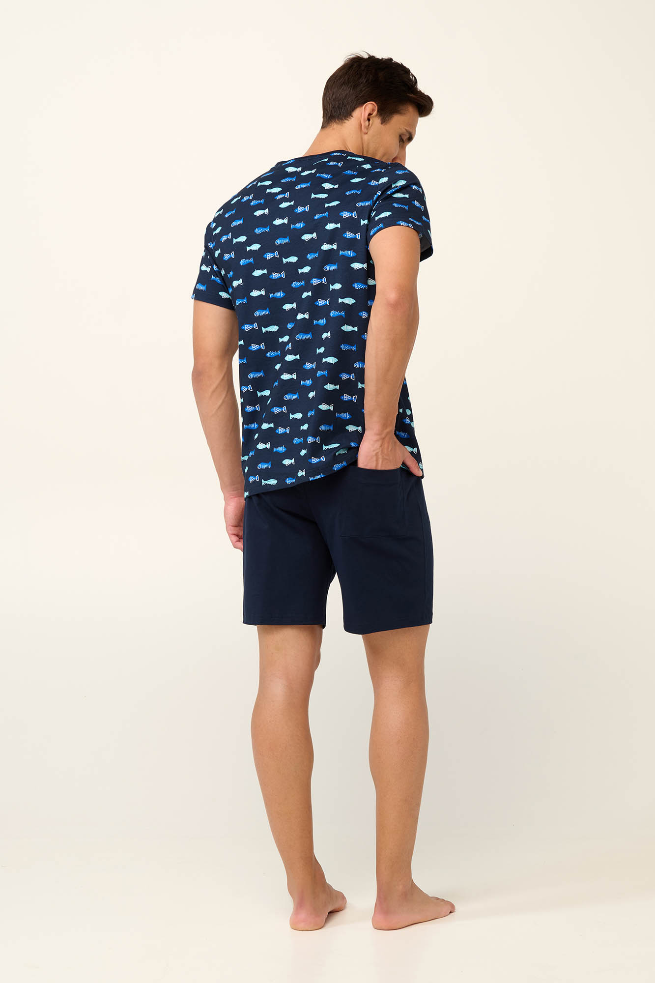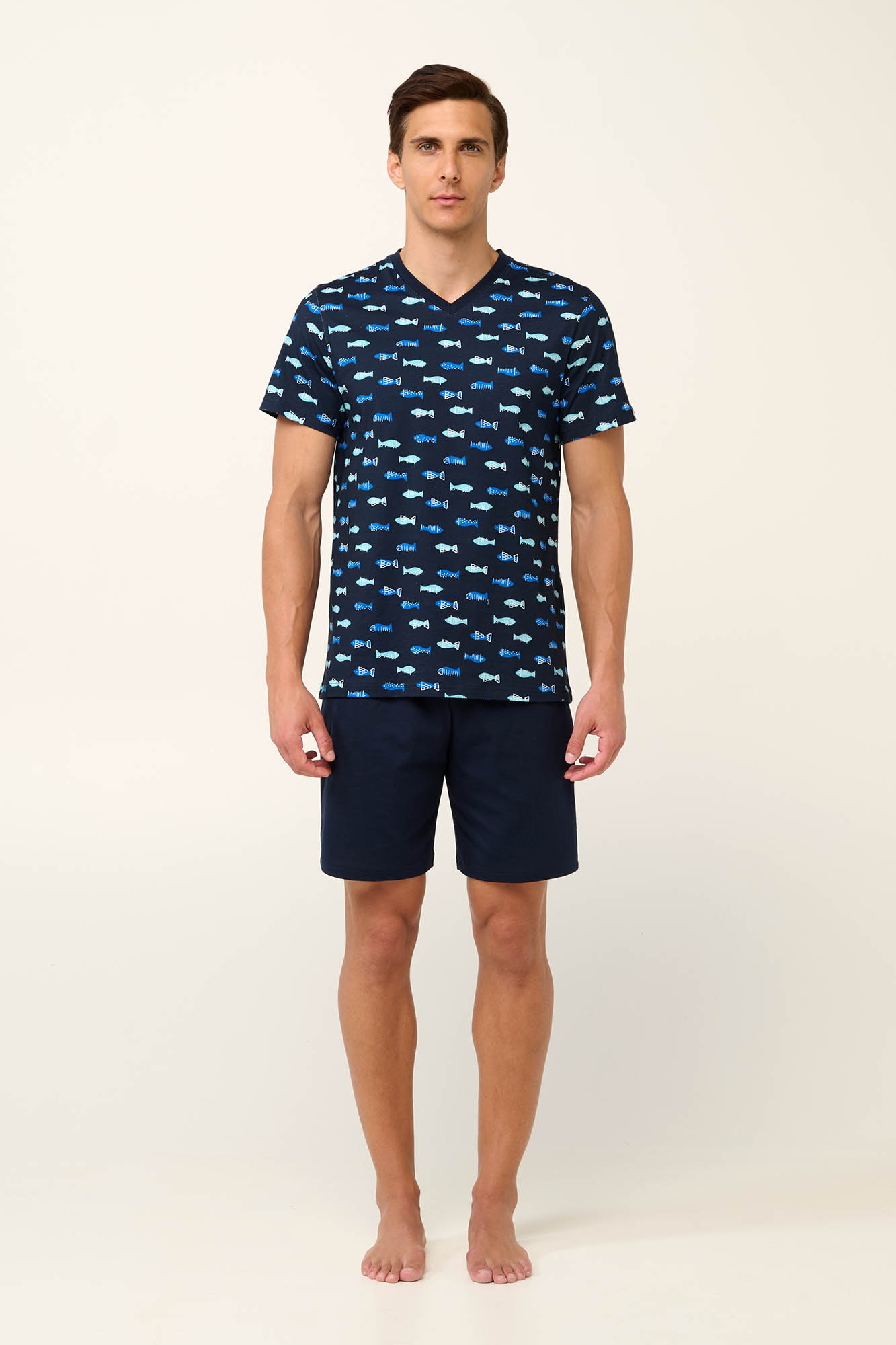 Επιλέξτε ένα καλοκαιρινό σετ ανδρικές πυτζάμες από 100% ελαφρύ βαμβάκι single jersey που επιτρέπει στο δέρμα να αναπνέει. Αποτελείται από μονόχρωμο κοντό παντελόνι με πίσω τσέπη που συνοδεύεται από μπλούζα με κοντό μανίκι και κλασική V λαιμόκοψη σε ένα χαριτωμένο μοτίβο με ψαράκια. Απολαύστε το βραδινό σας ύπνο ή ένα χαλαρό σαββατοκύριακο με απόλυτη άνεση.