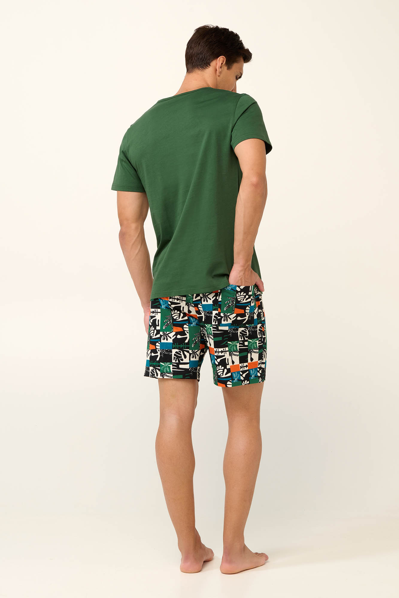Επιλέξτε ένα σετ καλοκαιρινές ανδρικές πυτζάμες που αποτελείται από κοντό παντελόνι σε μοτίβο που θυμίζει ζωγραφική τον σπηλαίων και μονόχρωμη μπλούζα με κοντό μανίκι ιδιαίτερη V λαιμόκοψη. Είναι κατασκευασμένο από 100% βαμβάκι single jersey που χαρίζει απαλή αίσθηση στο σώμα και επιτρέπει στο δέρμα να αναπνέει για να σας κρατήσει δροσερούς ακόμη και τις πιο ζεστές ημέρες. Απολαύστε στιγμές χαλάρωσης και το βραδινό σας ύπνο.