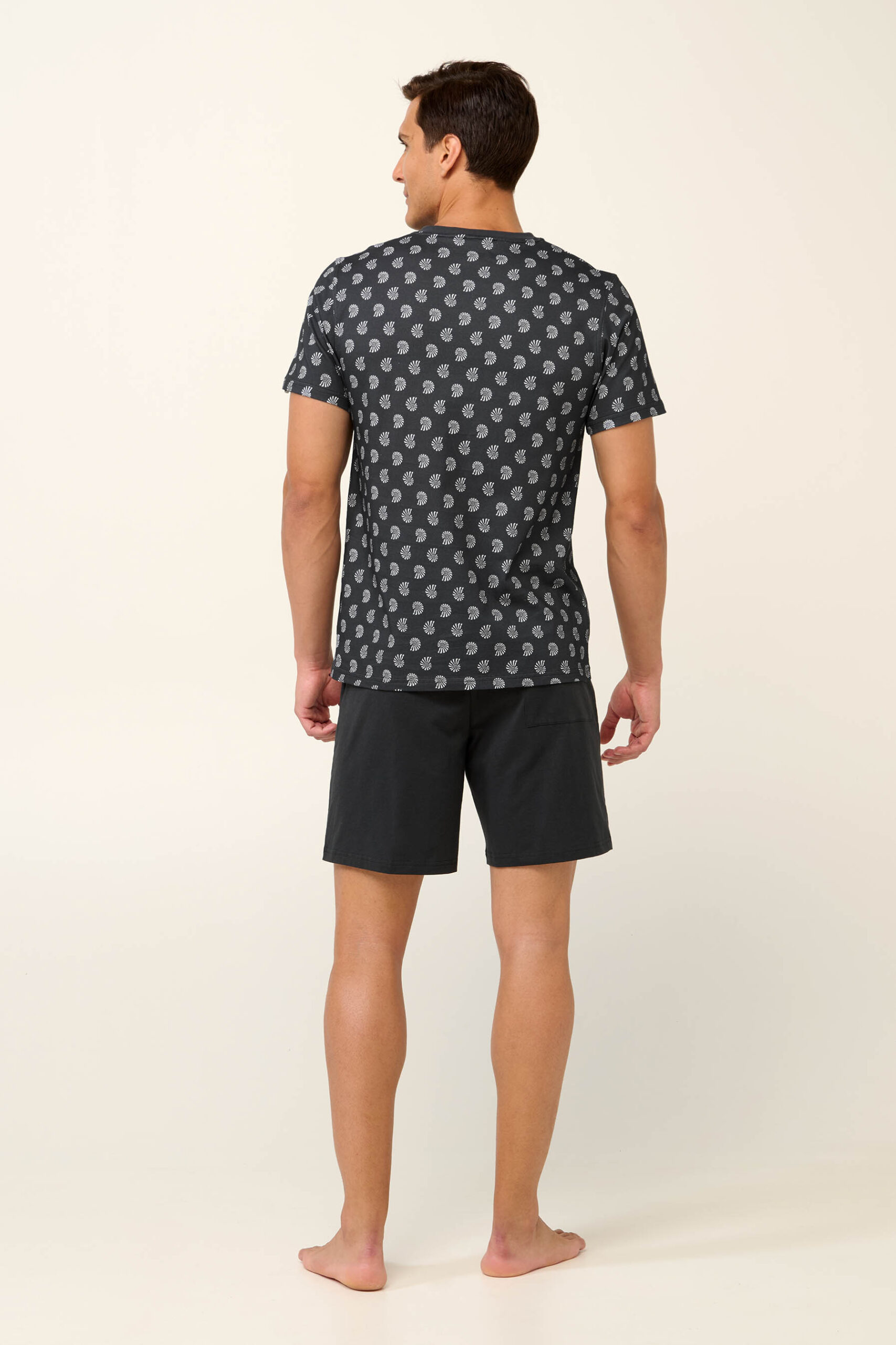 Προσθέστε στη συλλογή σας ένα σετ καλοκαιρινές ανδρικές πυτζάμες που θα σας χαρίσουν άνεση για να απολαύσετε το βραδινό σας ύπνο και στιγμές χαλάρωσης κάθε στιγμή της ημέρας. Αποτελείται από μονόχρωμο κοντό παντελόνι με τσέπη πίσω και μπλούζα με κοντό μανίκι και λαιμόκοψη V σε δροσερό τύπωμα που θυμίζει θάλασσα. Είναι κατασκευασμένο από 100% βαμβάκι single jersey που επιτρέπει στο δέρμα να αναπνέει και προσφέρει άνετη εφαρμογή.