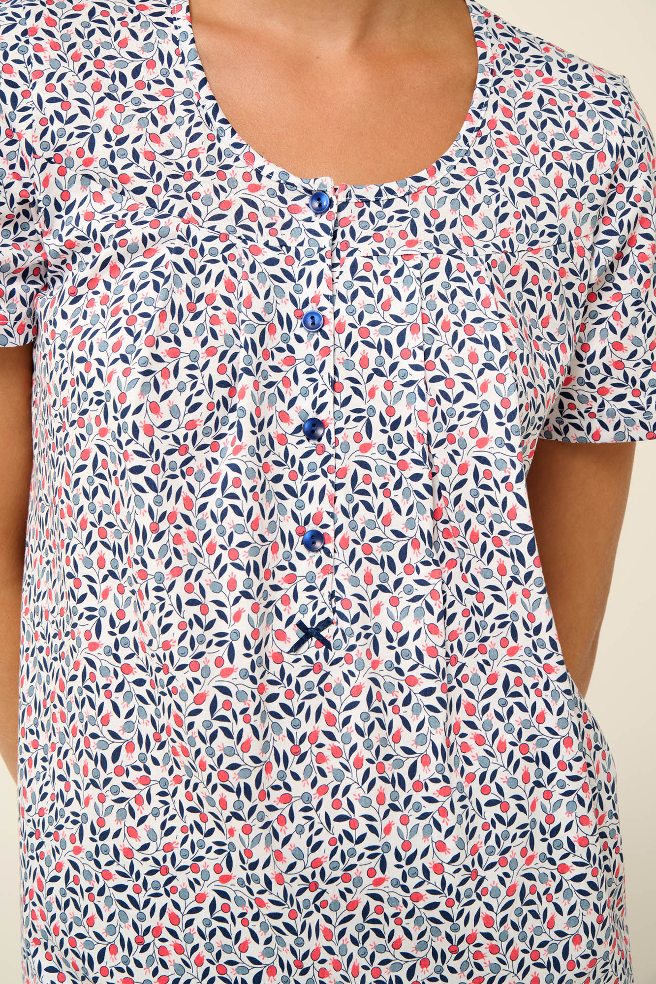 Επιλέξτε ένα σετ καλοκαιρινές γυναικείες πυτζάμες που αποτελείται από μονόχρωμο κάπρι παντελόνι και φλοράλ μπλούζα με κοντό μανίκι και πατιλέτα. Σχεδιασμένο σε κανονική γραμμή με σούρες στο στήθος για άνετη που προσφέρουν άνετη εφαρμογή και μια πινελιά νεανικής θηλυκής γοητείας. Είναι κατασκευασμένο από 100% διαπνέον βαμβάκι signle jersey που θα σας κρατήσει δρσερή και ανάλαφρη κάθε στιγμή της ημέρας.