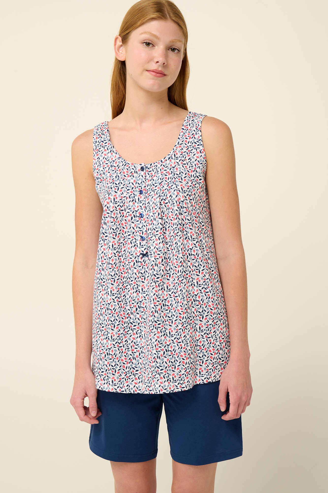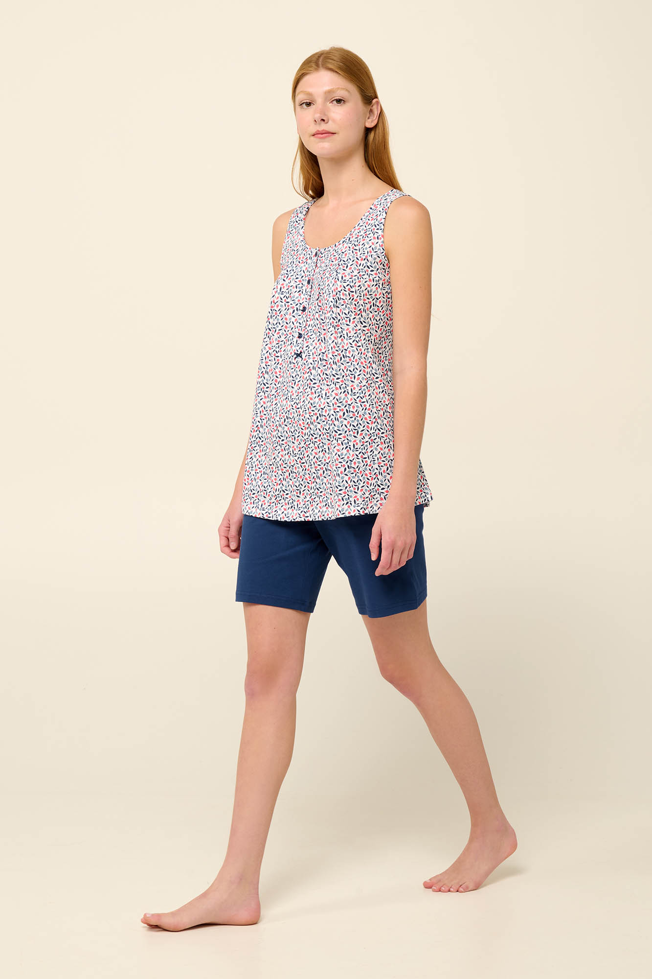 Ανανεώστε τη διάθεση σας με ένα σετ καλοκαιρινές γυναικείες πυτζάμες από 100% βαμβάκι single jersey που επιτρέπει στο σώμα να αναπνέει και χαρίζει απαλή αίσθηση για να απολαύσετε στιγμές χαλάρωσης ακόμη κι τις πιο ζεστές ημέρες.. Το σετ αποτελείται από μονόχρωμο κοντό παντελόνι και αμάνικο φλοράλ τοπ με πρακτική πατιλέτα και σούρες στο στήθος για πιο άνετη εφαρμογή και ανάλαφρη αίσθηση.