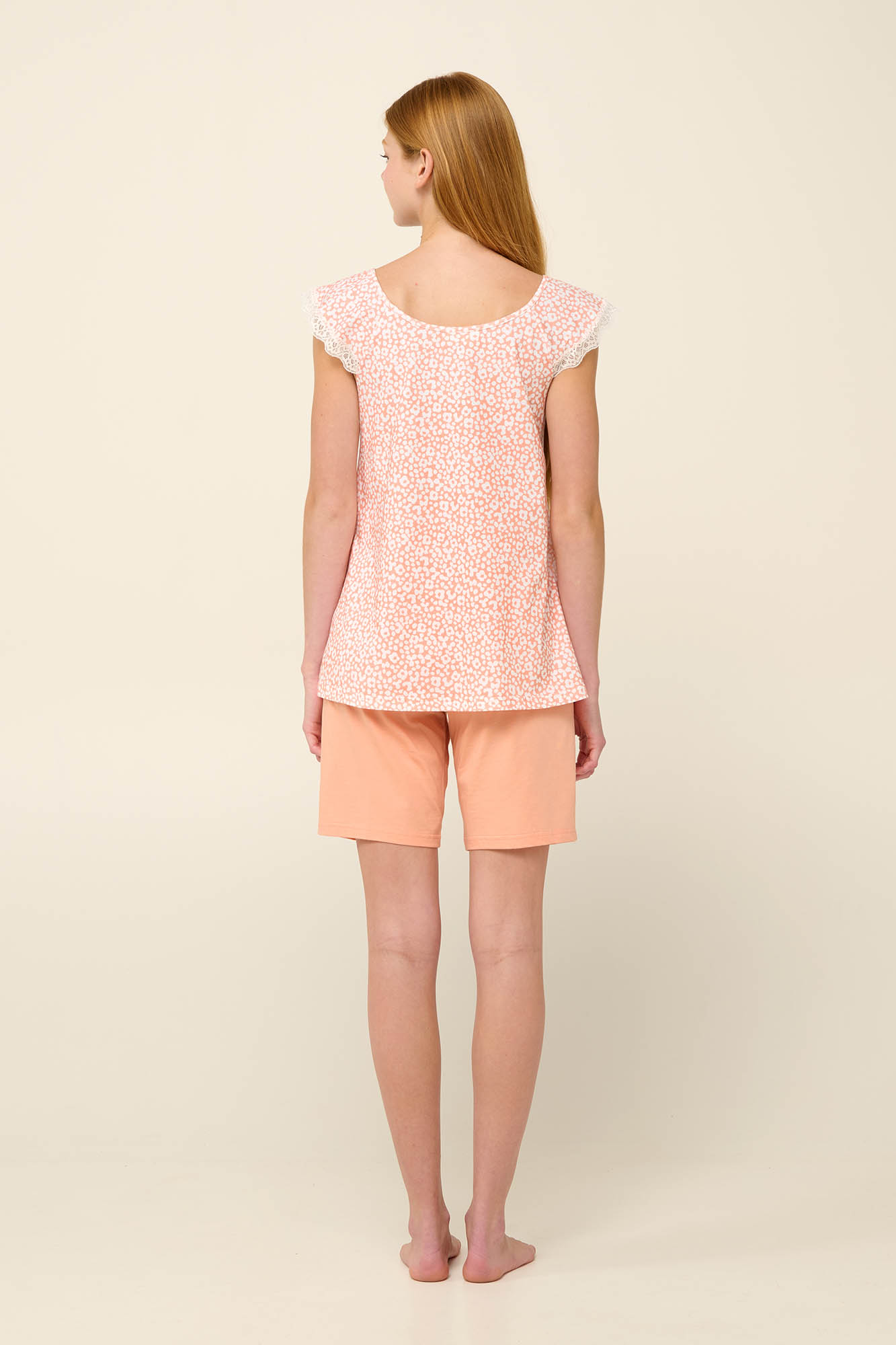 Χαλαρώστε κάθε στιγμή της ημέρας με ένα σετ καλοκαιρινές γυναικείες πυτζάμες με μονόχρωμο κοντό παντελόνι και μπλούζα σε δροσερό φλοράλ μοτίβο. Σχεδιασμένο σε κανονική γραμμή με κοντό μανίκι διακοσμημένο με δαντέλα και πατιλέτα που χαρίζουν θηλυκότητα και ρομαντισμό. Είναι κατασκευασμένες από 100% βαμβάκι single jersey που επιτρέπει στο δέρμα να αναπνέει και έχει απαλή αίσθηση στο σώμα.