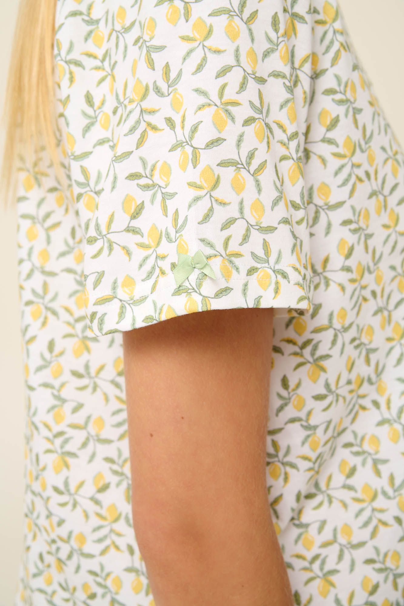 Δώστε μια νότα φρεσκάδας στα ζεστά βράδια φορώντας ένα σετ καλοκαιρινές γυναικείες πυτζάμες με δροσερά λεμόνια σε απαλή πράσινη απόχρωση. Αποτελείται από κοντό παντελόνι και κουμπωτό πάνω μέρος με πέτο που χαρίζει κλασική γοητεία. Κατασκευασμένο από 100% διαπνέον βαμβάκι single jersey θα σας χαρίσει την απαραίτητη δροσερή και ανάλαφρη αίσθηση για να απολαύσετε το βραδινό σας ύπνο ή ένα όμορφο απόγευμα.