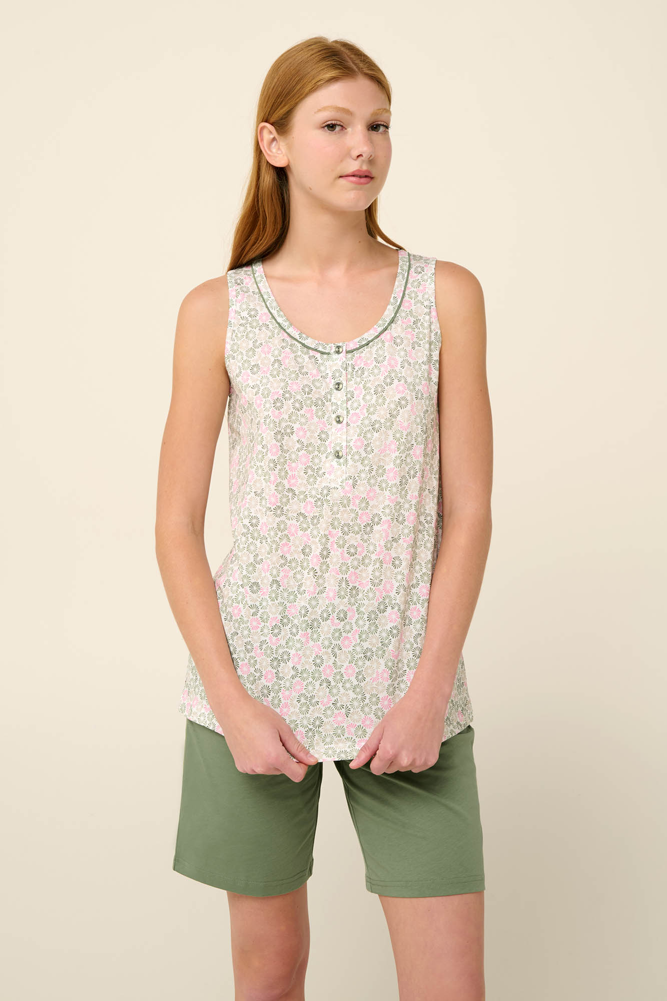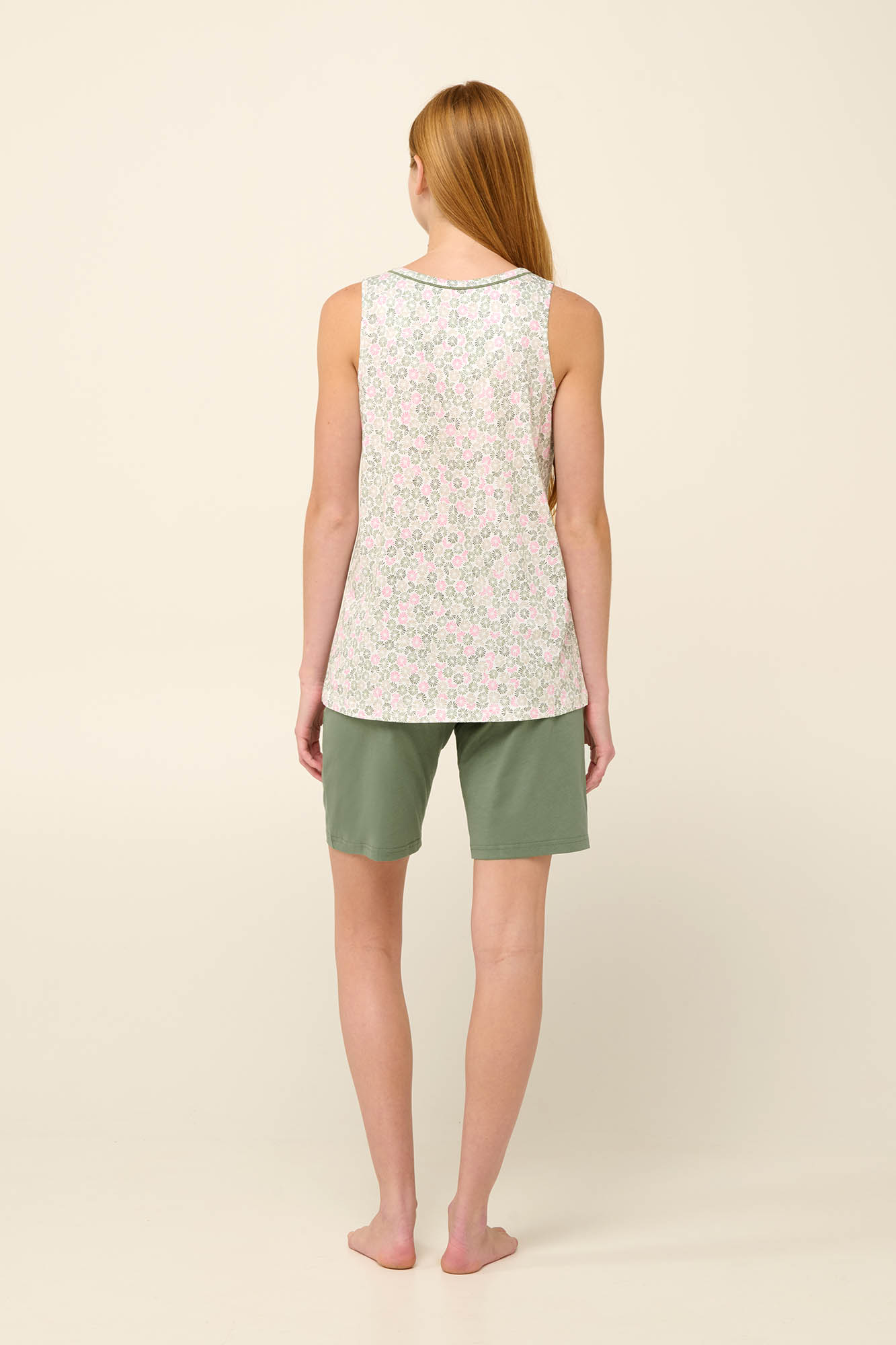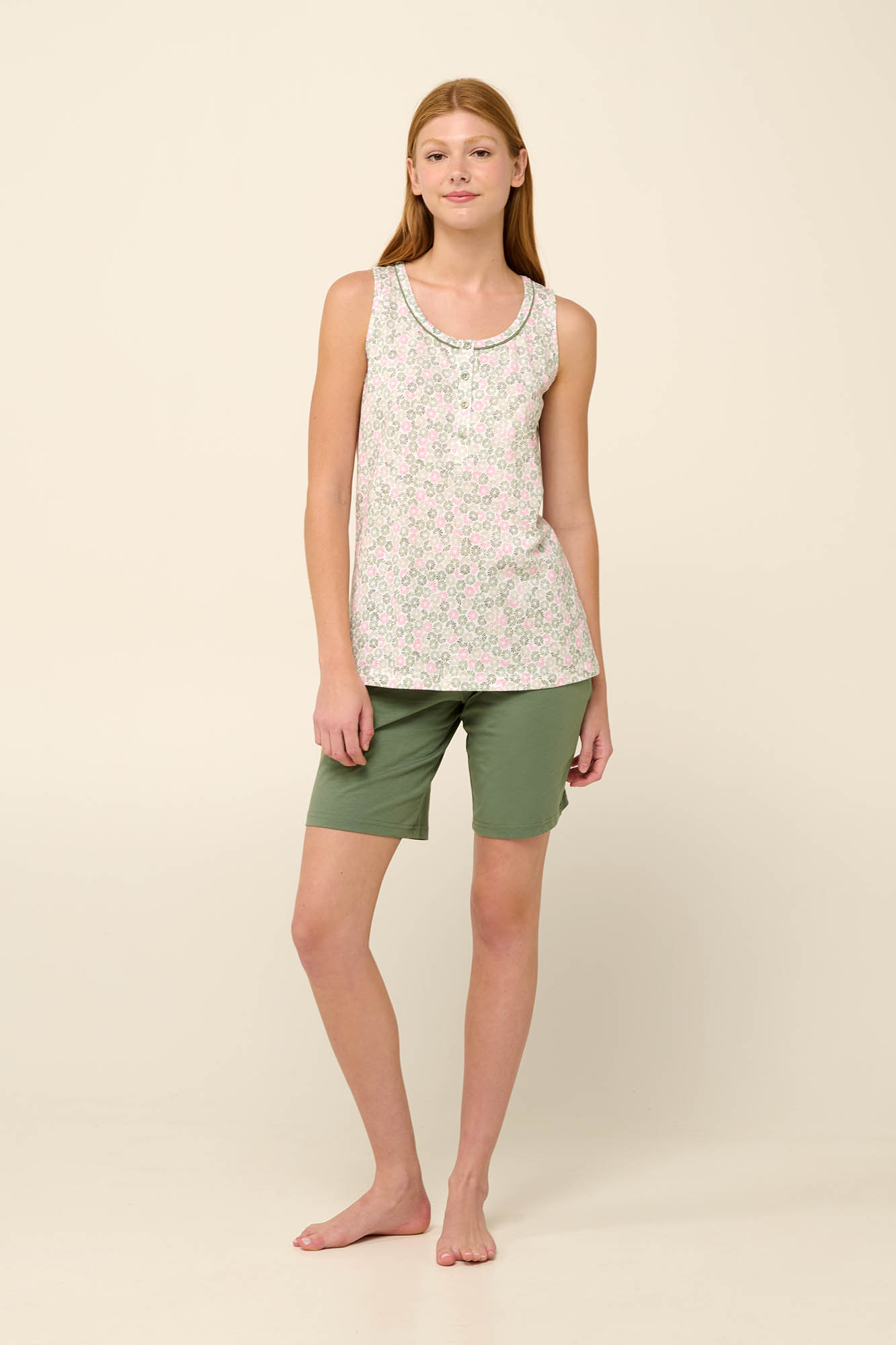 Απολαύστε στιγμές χαλάρωσης ακόμη και τις πιο ζεστές καλοκαιρινές νύχτες με ένα σετ γυναικείες πυτζάμες. Το σετ αποτελείται από μονόχρωμο κοντό παντελόνι που συνοδεύεται από αμάνική μπλούζα με πατιλέτα σε ένα άκρως καλοκαιρινό μοτίβο που θυμίζει κοχύλια στην ακτή. Είναι κατασκευασμένο από 100% διαπνέον βαμβάκι single jersey που θα σας χαρίσει απαλή και δροσερή αίσθηση στο σώμα.
