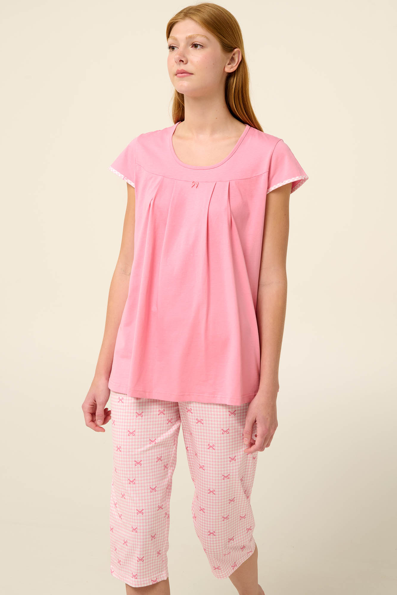 Απολαύστε χαλαρά απογεύματα με ένα σετ καλοκαιρινές γυναικείες πυτζάμες. Κάπρι παντελόνι με φιογκάκια σε καρό καμβά και μονόχρωμη μπλούζα με κοντό μανίκι και σούρες στο στήθος που χαρίζουν άνεση και γοητεία. Κατασκευασμένο σε κανονική γραμμή από 100% βαμβάκι single jersey αφήνει απαλή αίσθηση στο σώμα και επιτρέπει στο δέρμα να αναπνέει για να κάνει τον ύπνο σας ευχάριστο ακόμα και τις πιο ζεστές ημέρες.