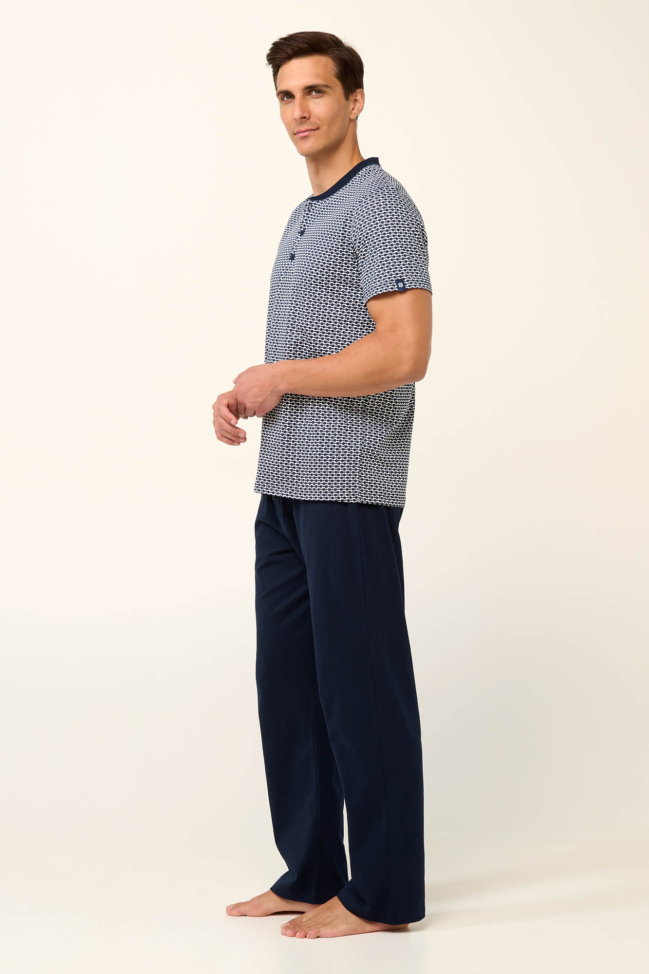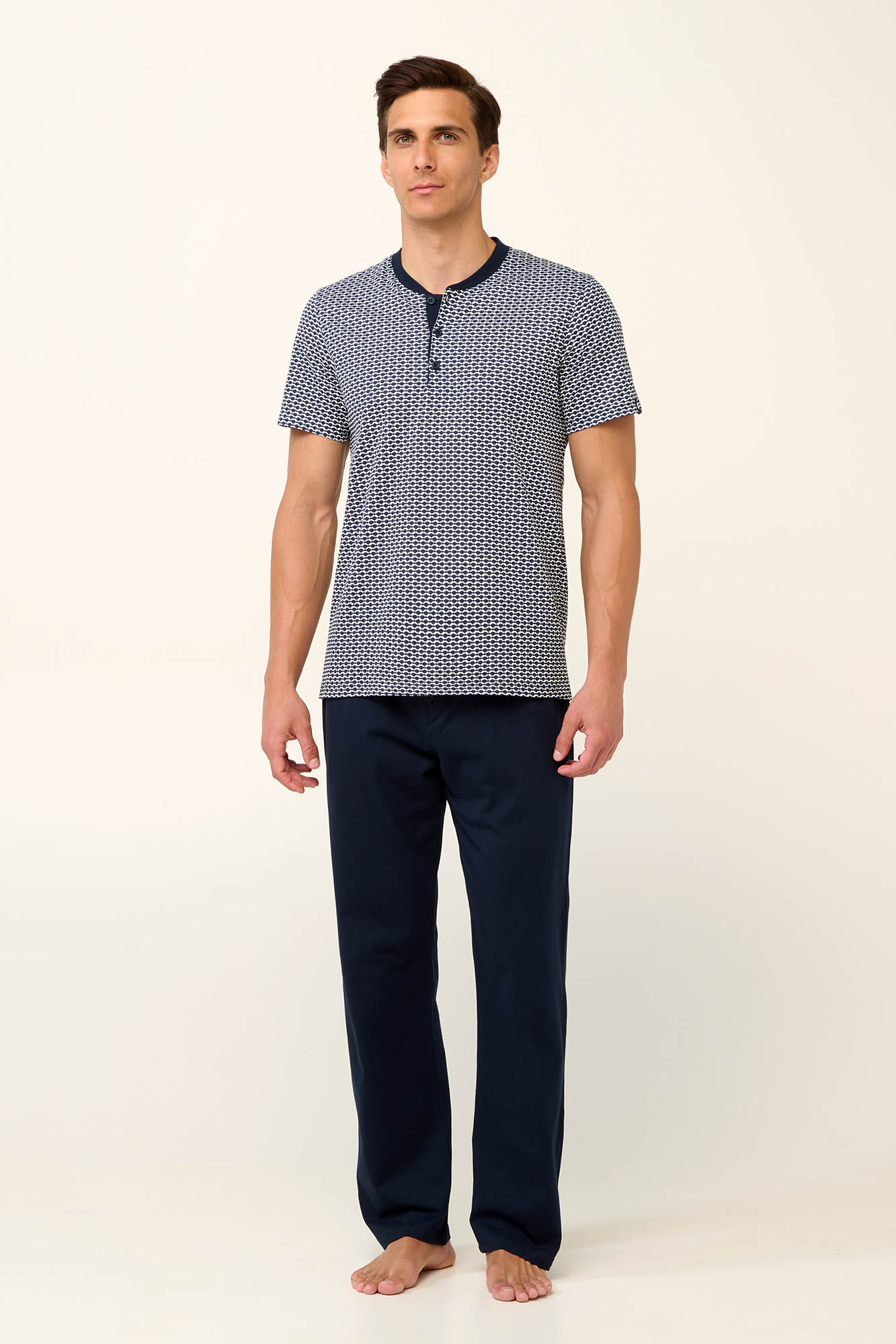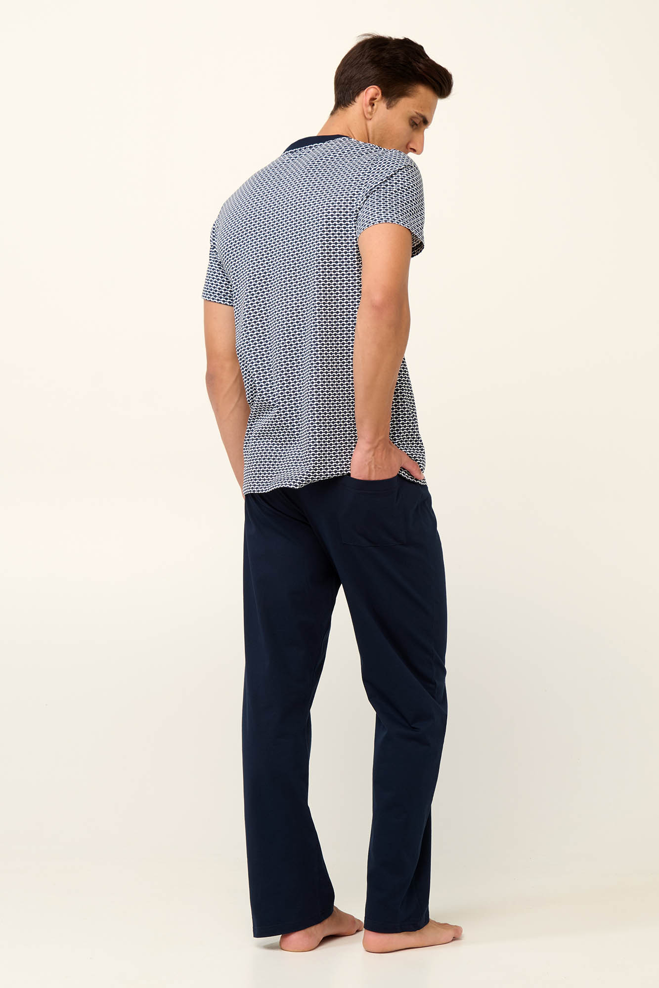 Επιλέξτε ένα ανδρικό σετ τριών τεμαχίων που αποτελείται από πυτζάμα με μονόχρωμο κοντό παντελόνι με τσέπη πίσω και μπλούζα με κοντό μανίκι και κλασική πατιλέτα σε γεωμετρικό μοτίβο. Το σετ συμπληρώνει ένα μονόχρωμο μακρύ παντελόνι με κουμπιά. Είναι κατασκευασμένο από 100% διαπνέον βαμβάκι single jersey με απαλό άγγιγμα στο σώμα για να απολαύσετε το βραδινό σας ύπνο ή ένα χαλαρό απόγευμα στο καναπέ μετά από μια μεγάλη ημέρα.
