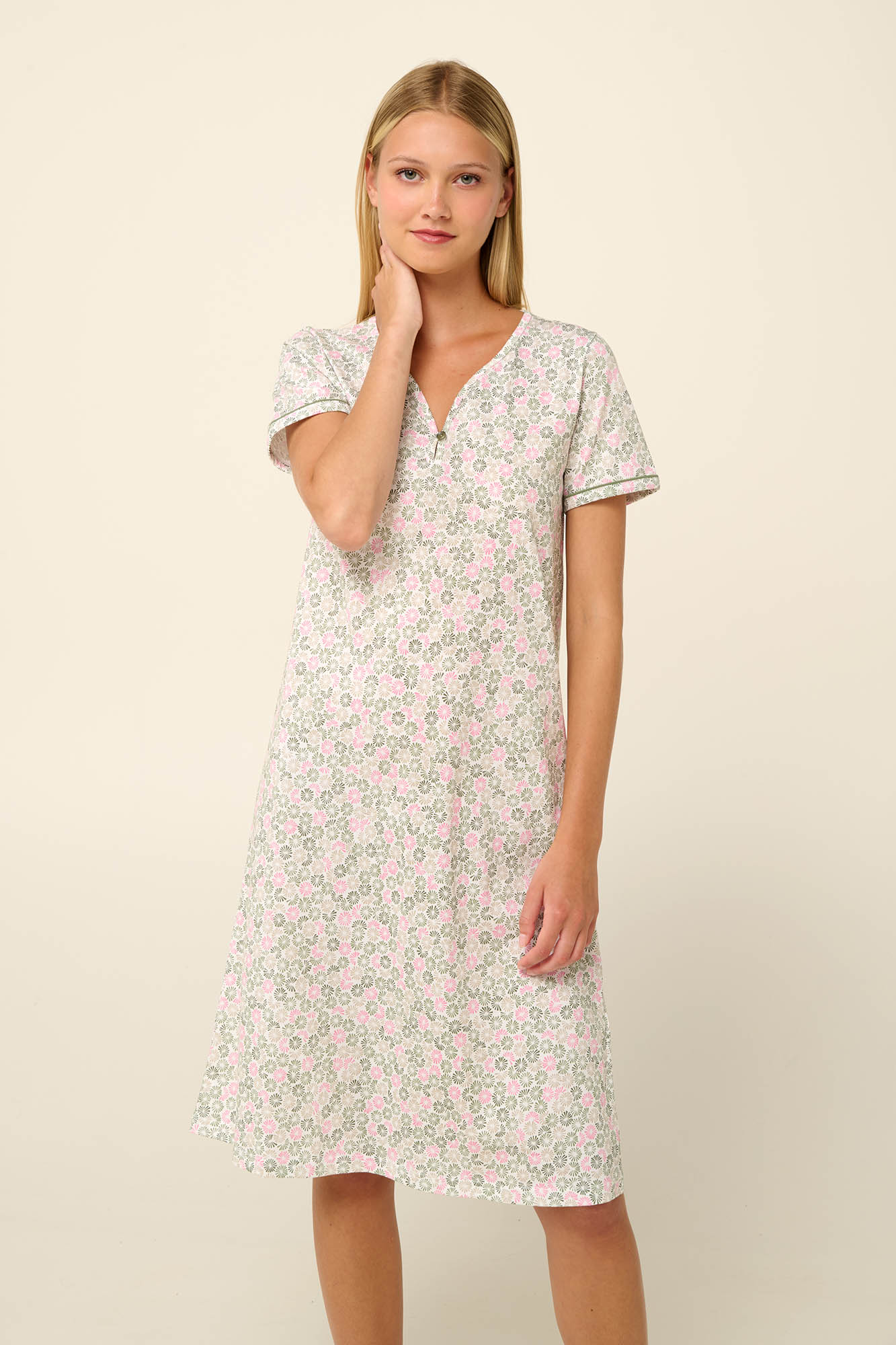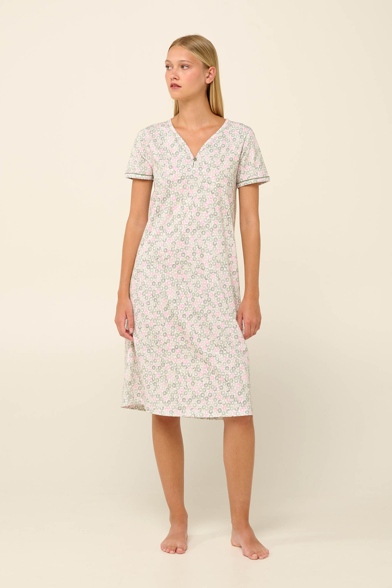 Προσθέστε μια νότα γοητείας στα βράδια σας με ένα καλοκαιρινό νυχτικό σε εμπριμέ μοτίβο. Σχεδιασμένο σε κανονική γραμμή με κοντό μανίκι και κουμπωτή V λαιμόκοψη, συνδυάζει κλασικό στυλ και άνεση. Φτιαγμένο από 100% διαπνέον βαμβάκι single jersey που χαρίζει απαλή και ανάλαφρη αίσθηση στο σώμα, θα σας κρατήσει δροσερή και θα απολαύσετε τον βραδινό σας ύπνο με ελευθερία κινήσεων και άνεση.