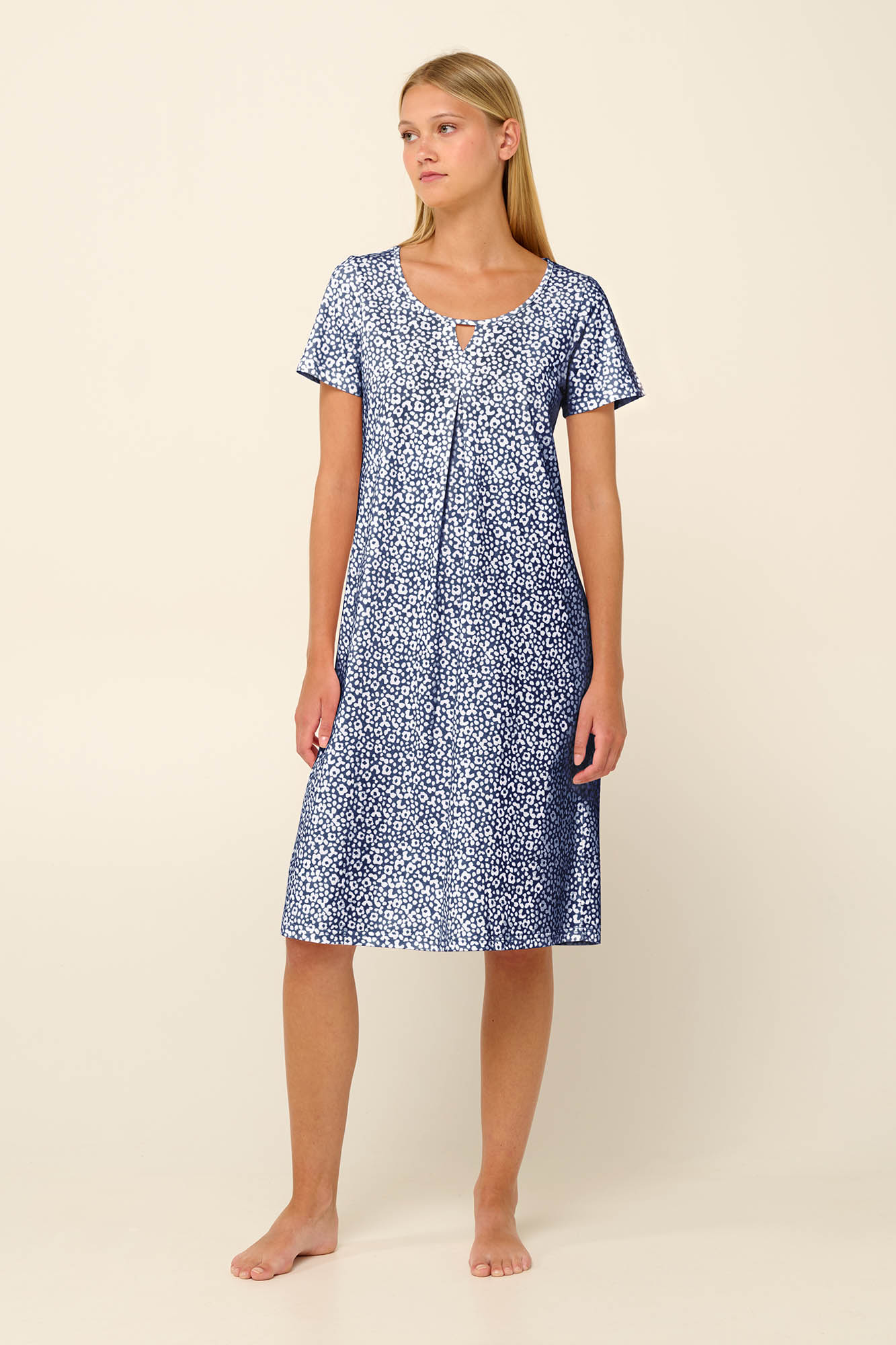 Επιλέξτε ένα καλοκαιρινό νυχτικό σε φρέσκο φλοράλ μοτίβο, σχεδιασμένο με κοντό μανίκι, στρογγυλή λαιμόκοψη και πιέτα μπροστά που χαρίζει επιπλέον άνεση και ελευθερία κινήσεων. Κατασκευασμένο σε χαλαρή γραμμή από 100% βαμβάκι single jersey που επιτρέπει στο σώμα να αναπνέει θα σας κρατήσει δροσερή και ανάλαφρη για να απολαύσετε το βραδινό σας ύπνο ή ένα χαλαρό πρωινό στις διακοπές.
