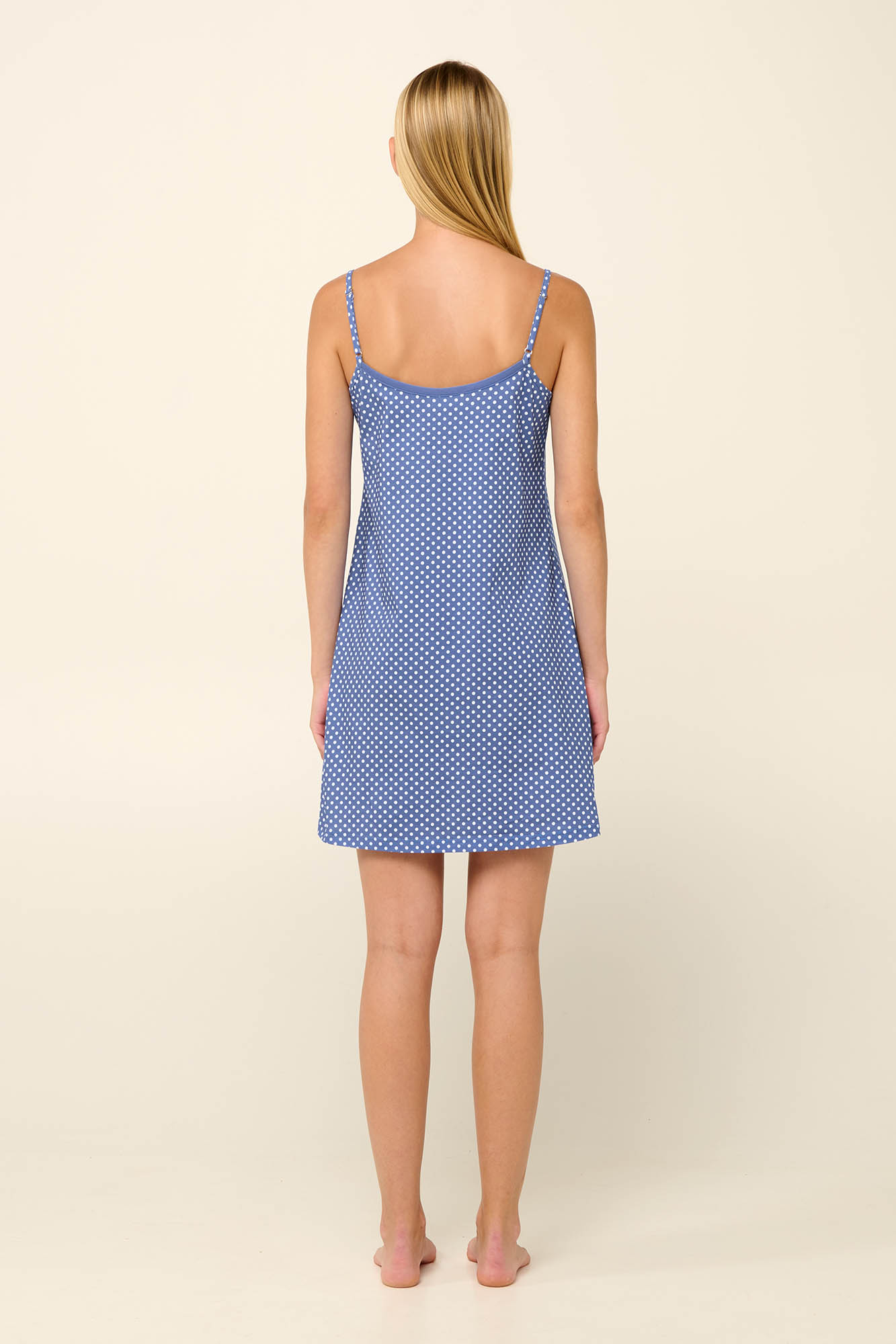Παραμείνετε δροσερή ακόμα και τις πιο ζεστές ημέρες φορώντας ένα ανάλαφρο καλοκαιρινό νυχτικό με προσαρμοζόμενες τιράντες σε γαλάζιο πουά μοτίβο. Είναι σχεδιασμένο σε κανονική γραμμή με διακριτική δαντέλα στη λαιμόκοψη που προσθέτει κομψότητα και ρομαντισμό. Κατασκευασμένο από 100% διαπνέον βαμβάκι single jersey είναι μια ιδανική επιλογή για ένα απόγευμα ή πρωινό στο σπίτι.