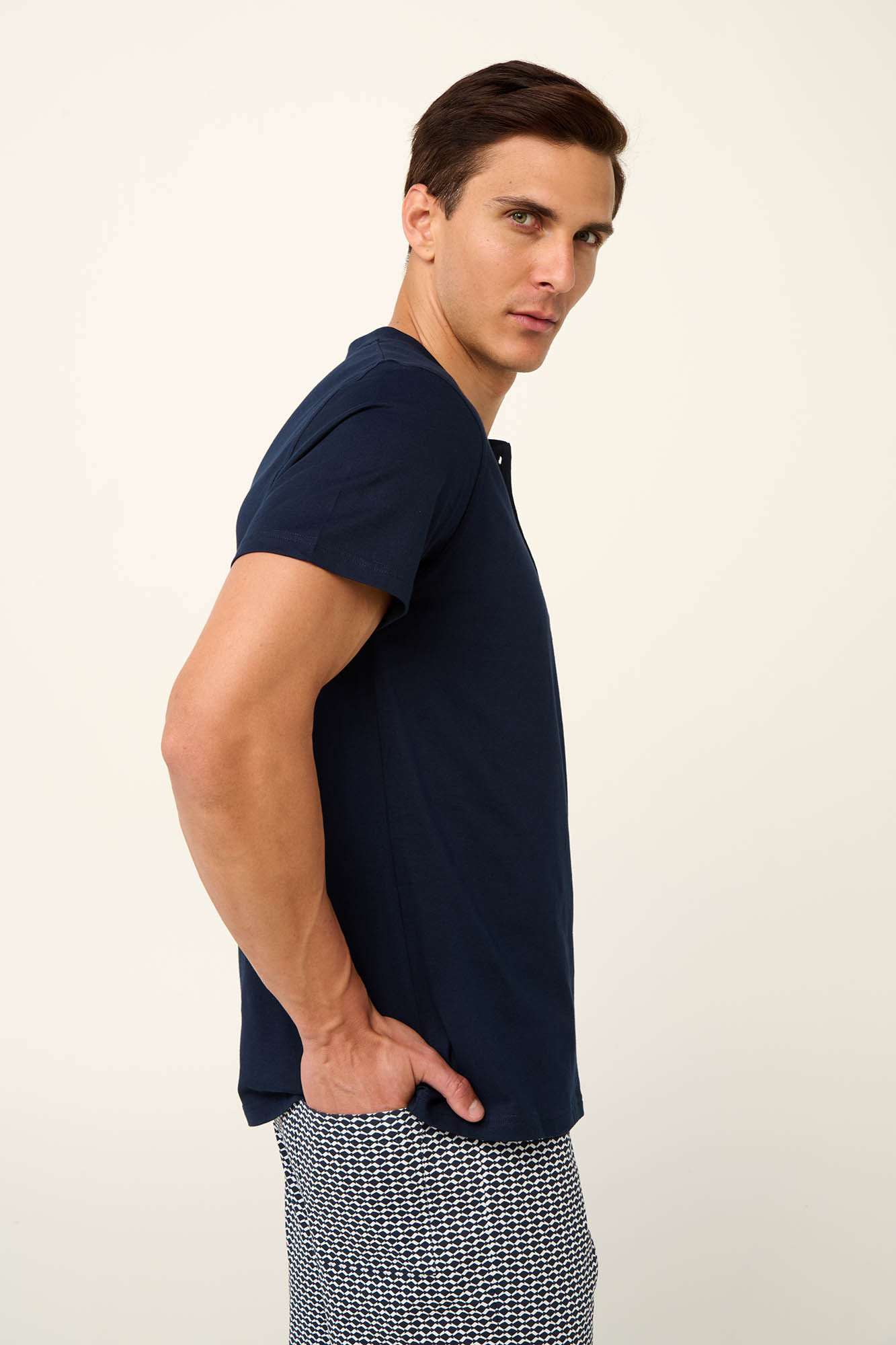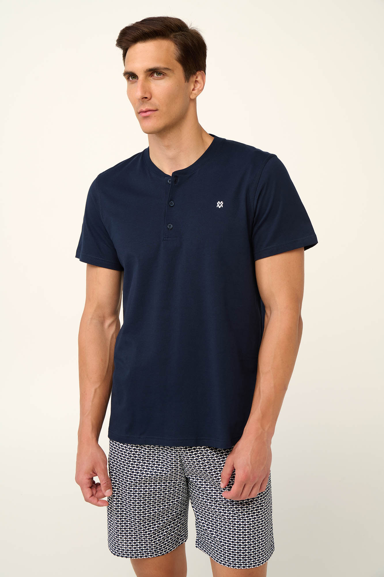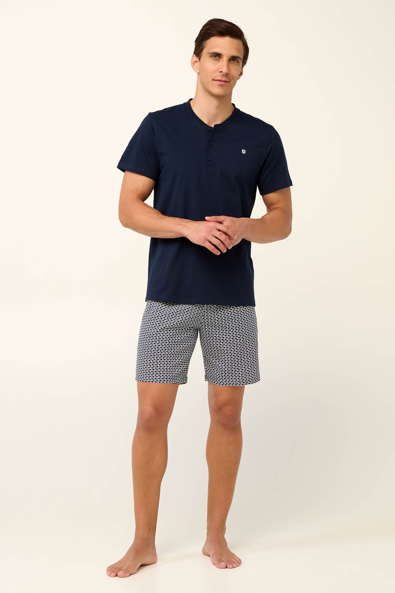Μια ανδρική καλοκαιρινή πυτζάμα σχεδιασμένη για να σας χαρίσει άνεση στυλ. Αποτελείται από κοντό παντελόνι με πίσω τσέπη σε γεωμετρικό μοτίβο με ψαράκια που συνοδεύεται από μονόχρωμη μπλούζα με κοντό μανίκι και κλασική πατιλέτα που προσθέτει μια διαχρονική νότα στο σύνολο. Το σετ είναι κατασκευασμένο από 100% απαλό βαμβάκι single jersey για να απολαύσετε ανάλαφρος τον βραδινό σας ύπνο ή ένα χαλαρό κυριακάτικο πρωινό.