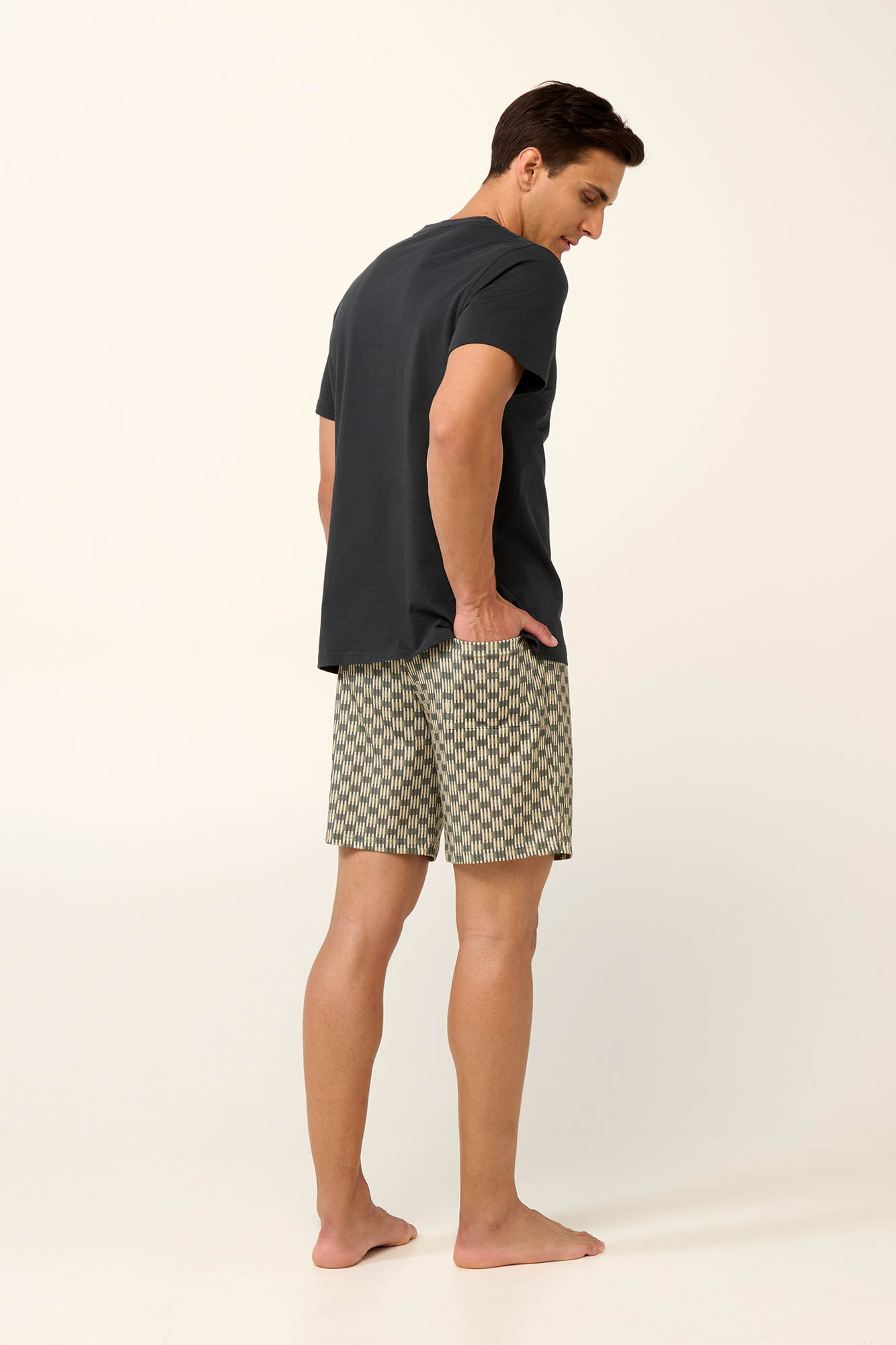 Ψάχνετε τις ιδανικές καλοκαιρινές ανδρικές πυτζάμες; Αυτό το σετ αποτελείται από παντελόνι με πρακτική πίσω τσέπη σε ριγέ-πλεκτό μοτίβο και μονόχρωμη μπλούζα με κοντό μανίκι και λαιμόκοψη σε σχήμα V. Είναι κατασκευασμένο σε κανονική γραμμή από 100% διαπνέον βαμβάκι που χαρίζει απαλή αίσθηση στο σώμα, για να παραμείνετε δροσερός και να χαλαρώσετε με άνεση ακόμα και τις πιο ζεστές καλοκαιρινές νύχτες.