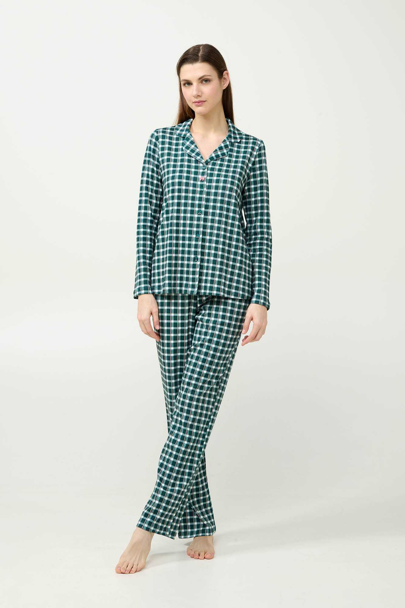 Αφεθείτε στην άνεση και το στυλ που χαρίζει αυτό το σετ γυναικείες πυτζάμες, κατασκευασμένο από 100% απαλό βαμβάκι interlock. Σχεδιασμένο με κλασικό κουμπωτό πάνω μέρος σε πράσινο καρό μοτίβο με λεπτές ροζ γραμμές, συνδυάζει διαχρονική γοητεία και καθημερινή άνεση. Ιδανικό για να απολαύσετε τις στιγμές χαλάρωσης σας ή το βραδινό σας ύπνο.