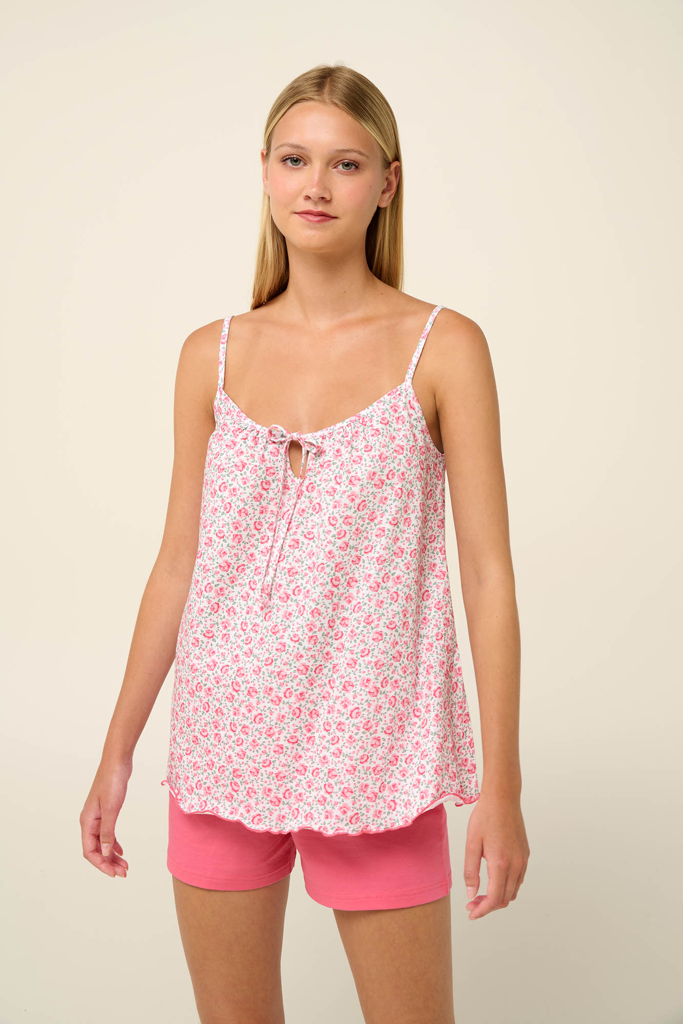 Αποκτείστε ένα babydoll που αποτελείται από μονόχρωμο κοντό παντελόνι και μπλούζα σε μοτίβο με ανθισμένα τριαντάφυλλα. Σχεδιασμένο με ρυθμιζόμενες τιράντες και δετή λαιμόκοψη αναδεικνύουν τη θηλυκότητα σας και χαρίζουν ανάλαφρη και δροσερή αίσθηση. Κατασκευασμένο από 100% βαμβάκι single jersey που επιτρέπει στο δέρμα να αναπνέει θα σας βοηθήσει να απολαύσετε το βραδινό σας ύπνο ή ένα χαλαρό Σαββατοκύριακο στο σπίτι.