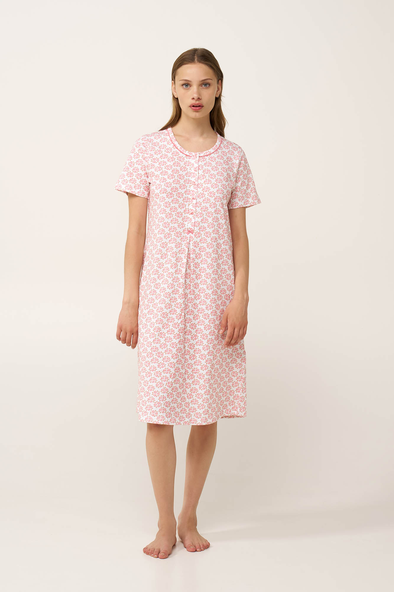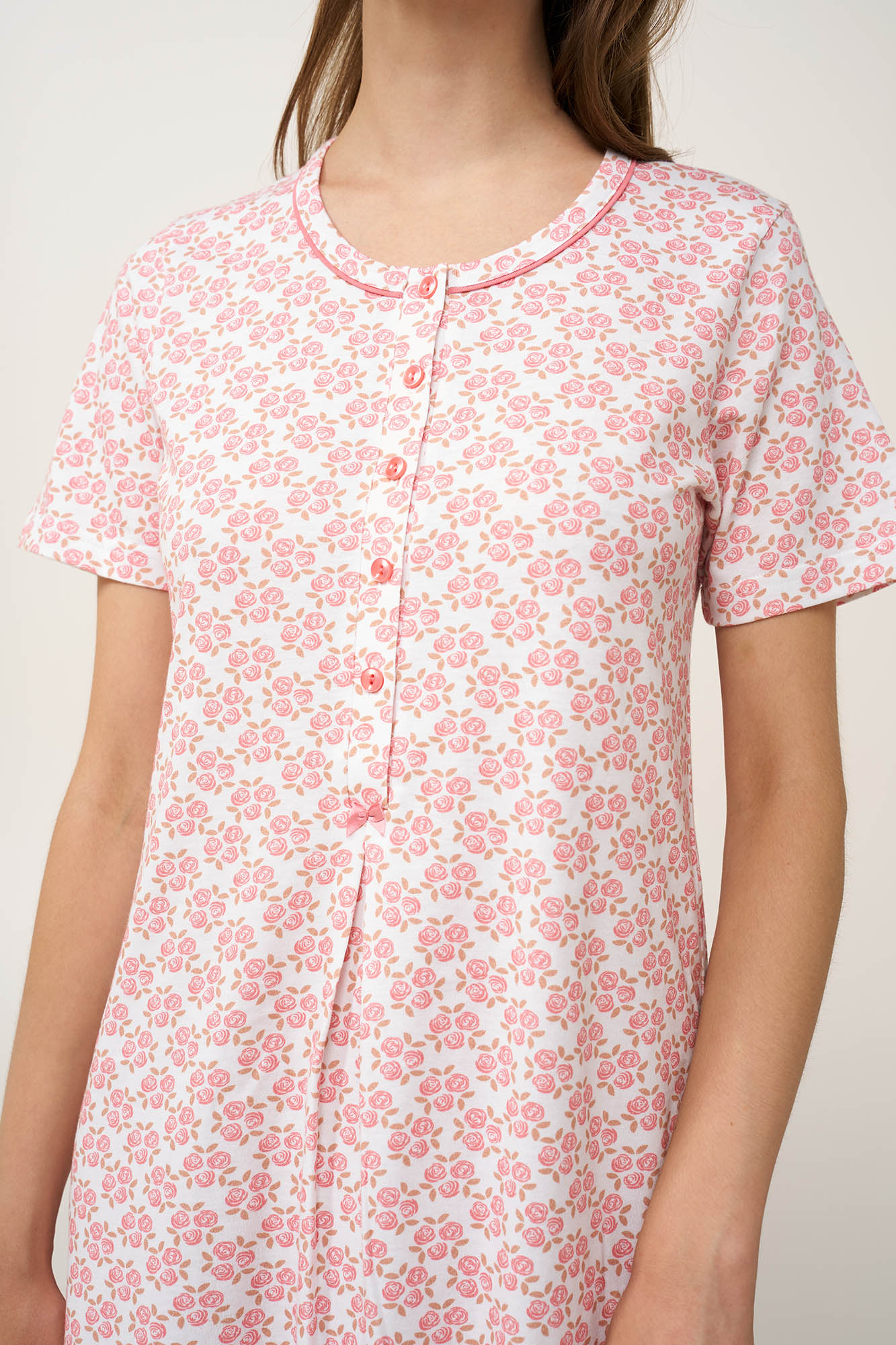 Απαλό και διαπνέον, αυτό το νυχτικό είναι κατασκευασμένο από 100% βαμβάκι single jersey, που προσφέρει ανάλαφρη και δροσερή αίσθηση τις ζεστές καλοκαιρινές νύχτες. Η πρακτική πατιλέτα εξυπηρετεί το θηλασμό, ενώ η διακριτική πιέτα κάτω από το στήθος δημιουργεί επιπλέον χώρο για πιο άνετη εφαρμογή στην περιοχή της κοιλιάς. Διακοσμημένο με ρομαντικό μοτίβο από τριαντάφυλλα σε ιβουάρ βάση, χαρίζει θηλυκή γοητεία σε μια κλασική γραμμή. Ιδανικό για χαλαρές ημέρες και στιγμές φροντίδας.