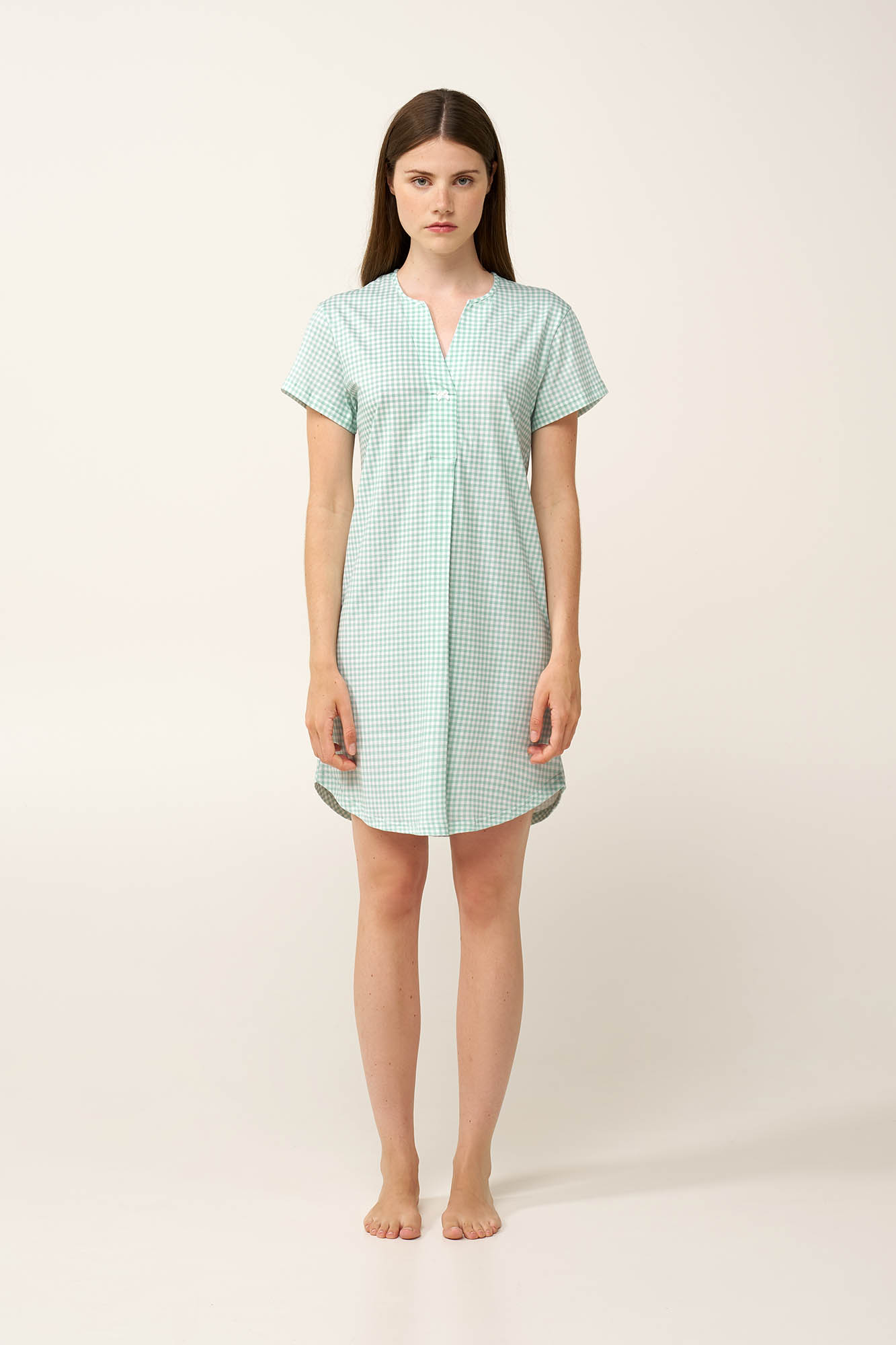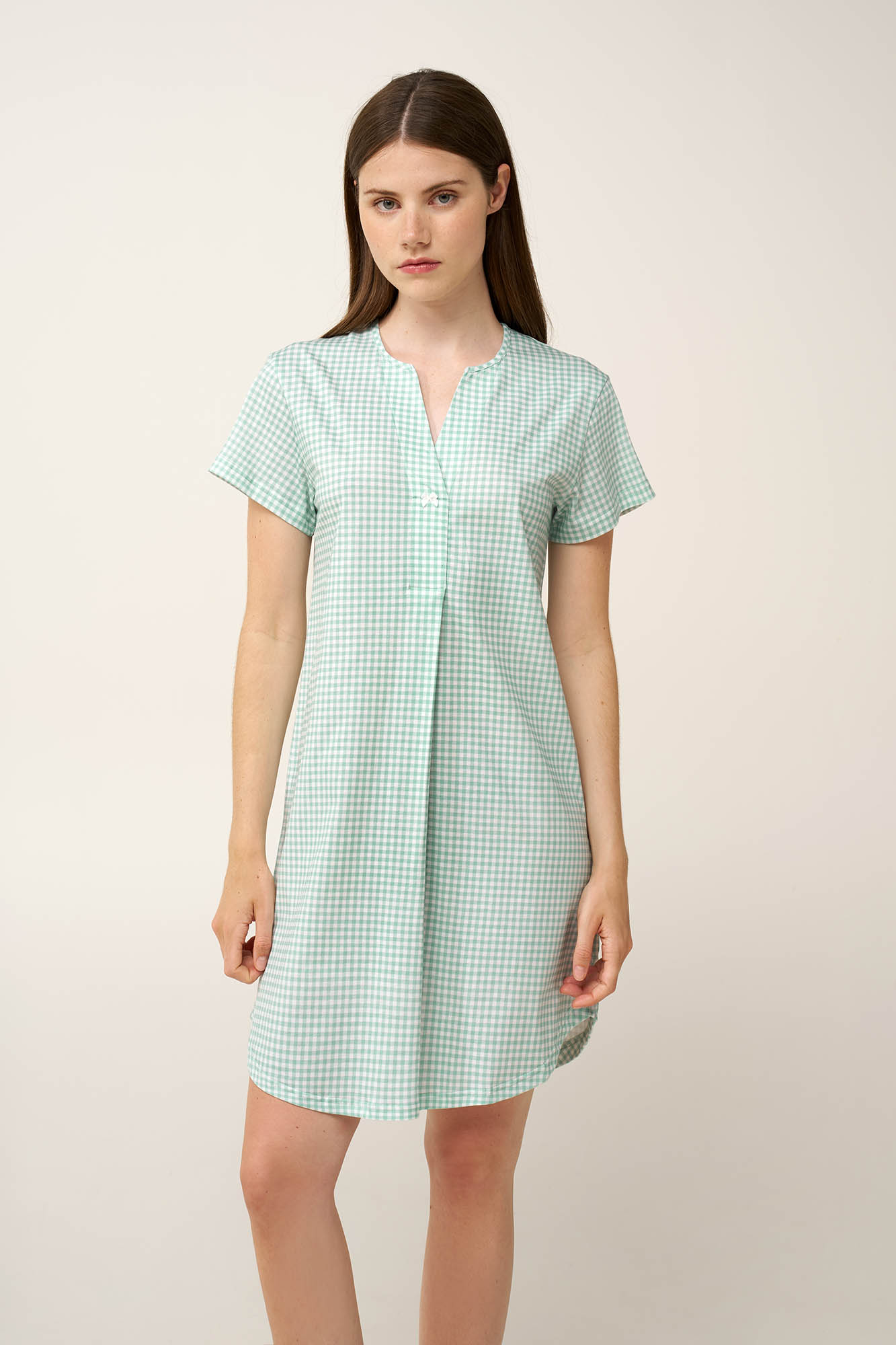 Επιλέξτε ένα καλοκαιρινό νυχτικό, κατασκευασμένο από απαλό και διαπνέον 100% βαμβάκι single jersey που χαρίζει ελαφριά και αέρινη αίσθηση. Η V λαιμόκοψη προσθέτει μια διακριτική νότα κομψότητας, ενώ η πιέτα στο μπροστινό μέρος προσφέρει επιπλέον χώρο για χαλαρή και άνετη εφαρμογή. Διακοσμημένο με διαχρονικό καρό gingham μοτίβο που θυμίζει καθαρό ουρανό και θαλασσινή αύρα, είναι ιδανικό για χαλάρωση, ύπνο ή ήρεμες στιγμές στο σπίτι.
