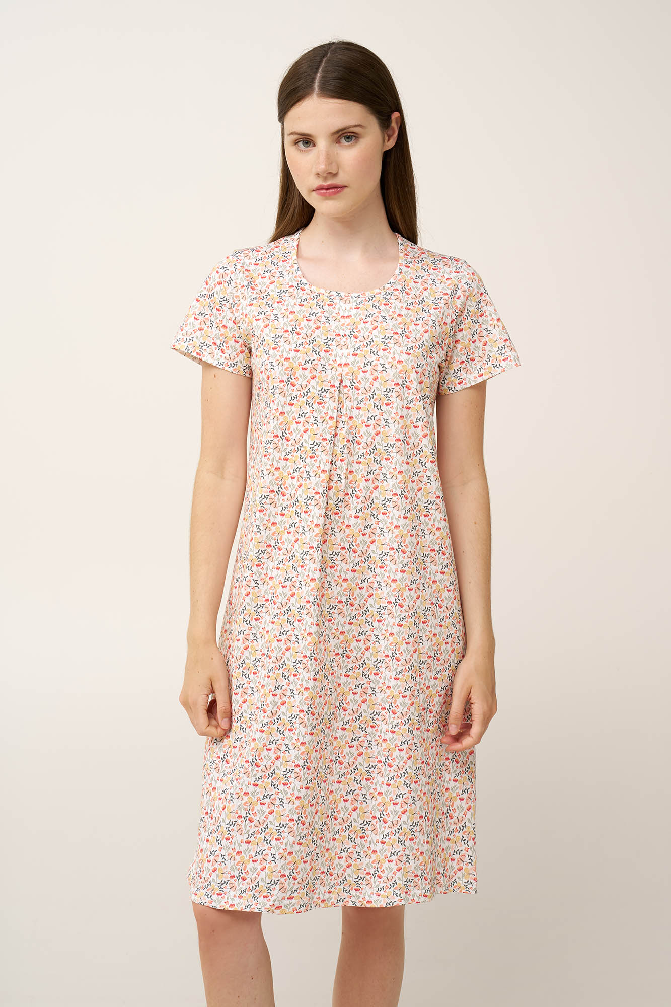 Επιλέξτε ένα νυχτικό, σχεδιασμένο για δροσερές καλοκαιρινές νύχτες. Κατασκευασμένο από απαλό και διαπνέον 100% βαμβάκι single jersey, προσφέρει ανάλαφρη αίσθηση στο δέρμα και άνεση καθ’ όλη τη διάρκεια της νύχτας. Τα κοντά μανίκια και η χαλαρή γραμμή συμπληρώνονται από μια απαλή πιέτα στο μπροστινό μέρος, που χαρίζει επιπλέον άνεση και άνετη εφαρμογή. Διακοσμημένο με παιχνιδιάρικες πεταλούδες και αγριολούλουδα εμπνευσμένα από έναν ανθισμένο ανοιξιάτικο κήπο, προσθέτει μια φωτεινή, χαρούμενη νότα σε ένα διαχρονικό σχέδιο.