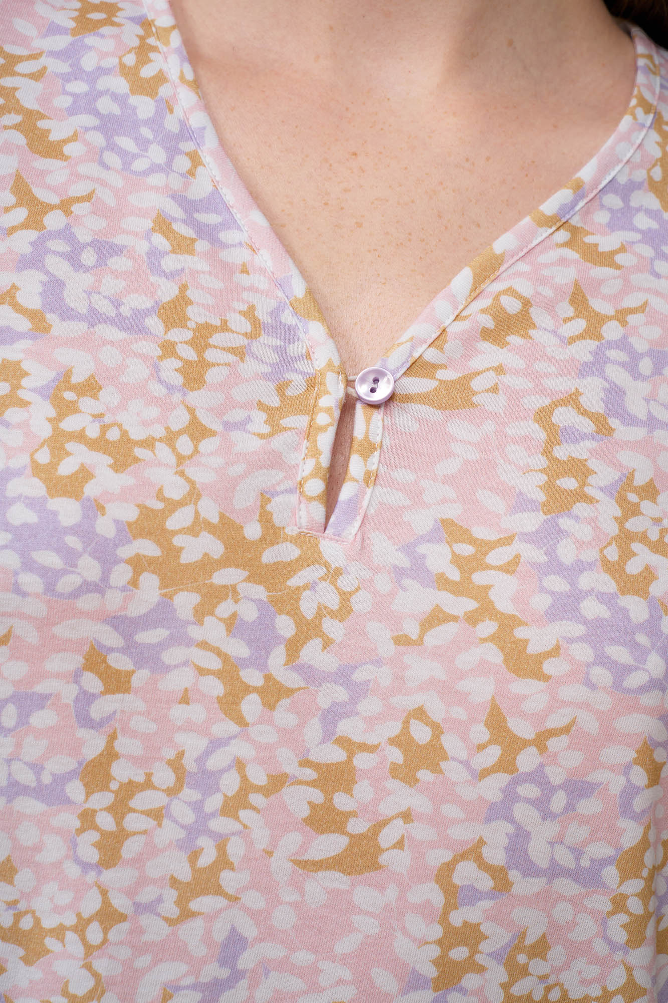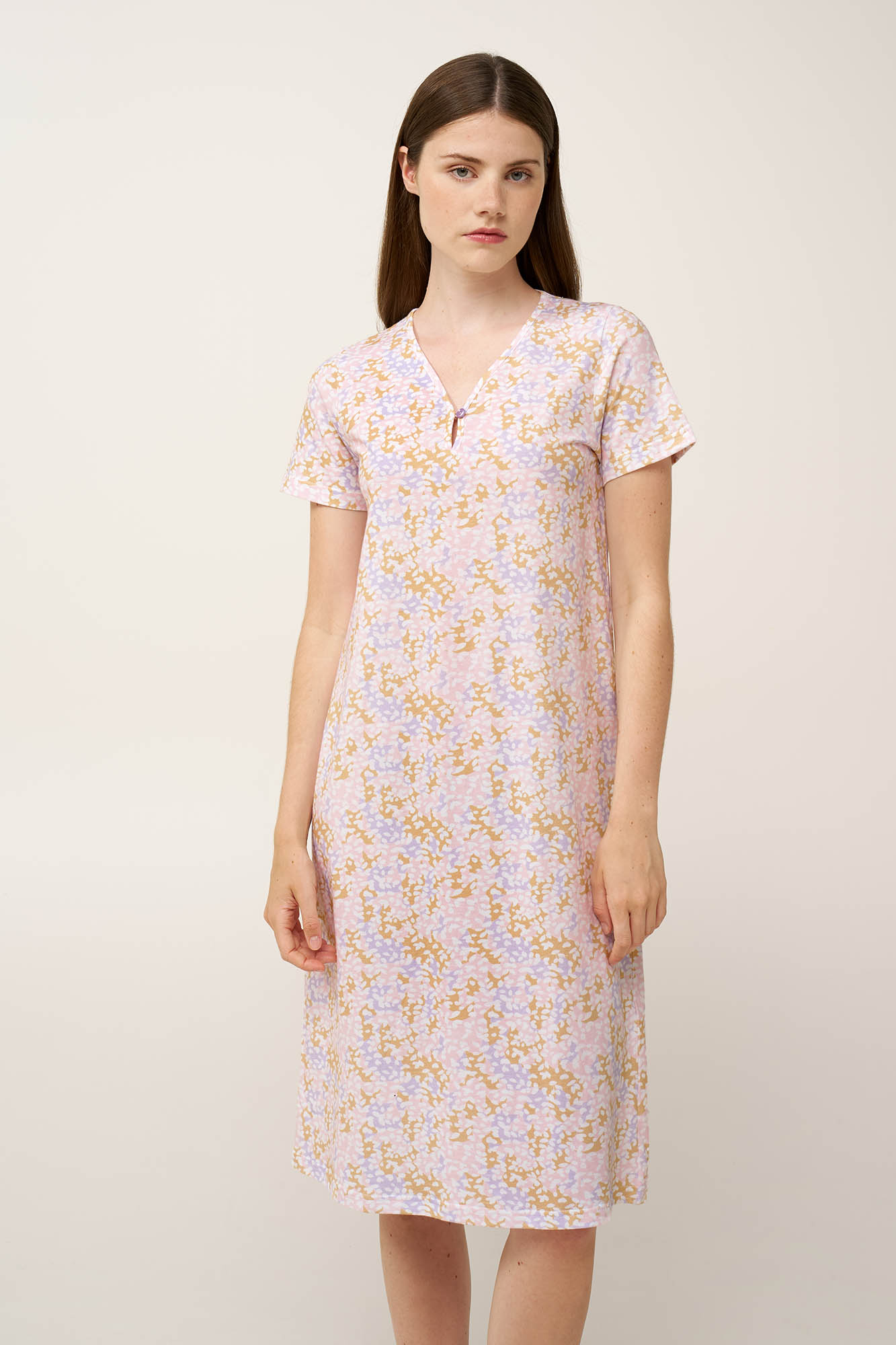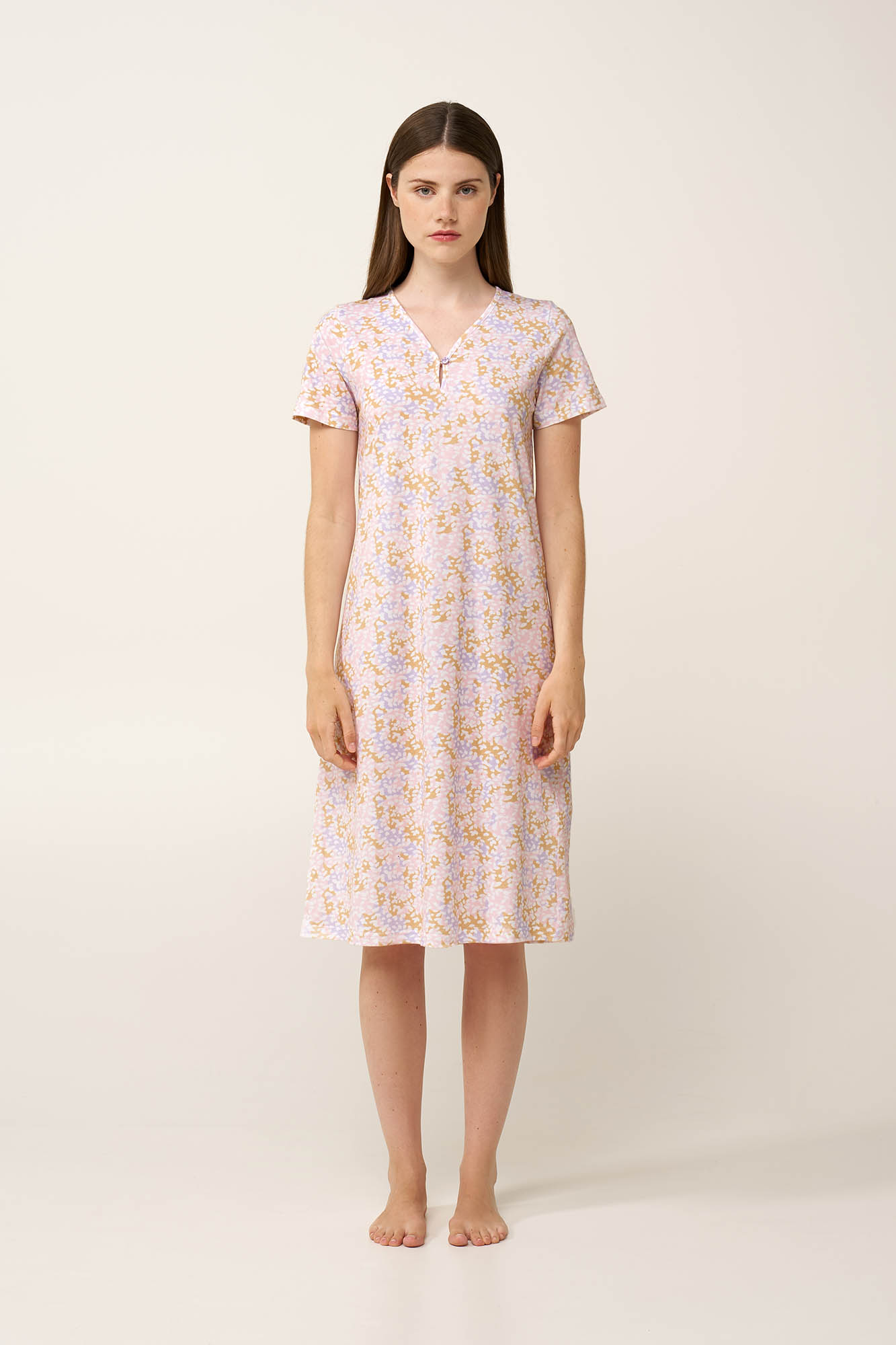 Δώστε άνεση και χαρακτήρα στις στιγμές χαλάρωσης σας, με ένα καλοκαιρινό νυχτικό, κατασκευασμένο από διαπνέον 100% βαμβάκι single jersey, αγκαλιάζει απαλά το σώμα με ελαφριά αίσθηση, ιδανική για ζεστές νύχτες στο σπίτι. Σχεδιασμένο με κοντά μανίκια και ιδιαίτερη V λαιμόκψη με ένα διακριτικό κουμπί προσθέτει πρακτικότητα και κομψότητα. Ιδανικό για ξεκούραστο ύπνο και ξεκούραστα πρωινά.